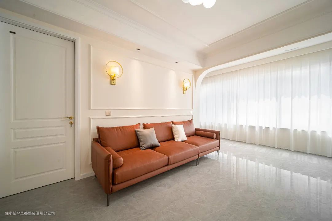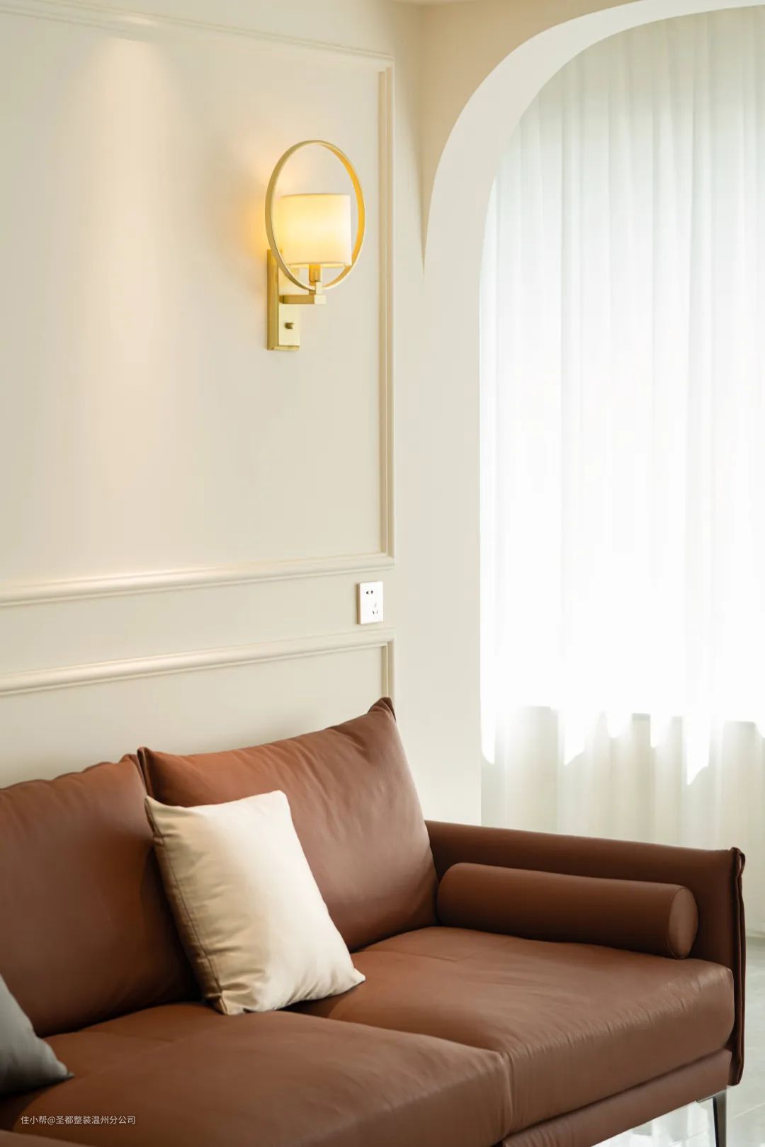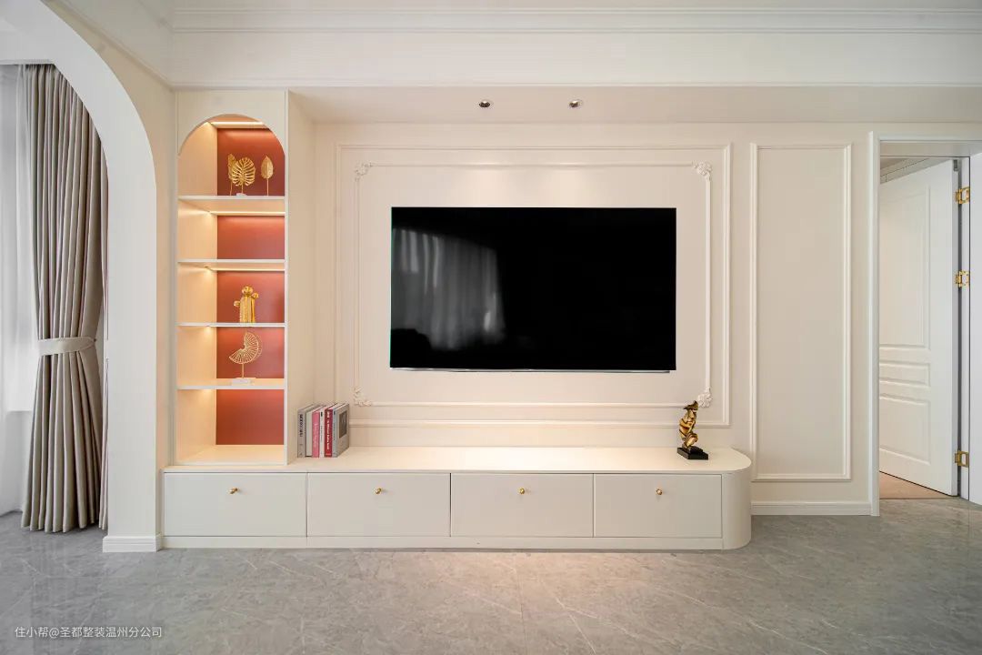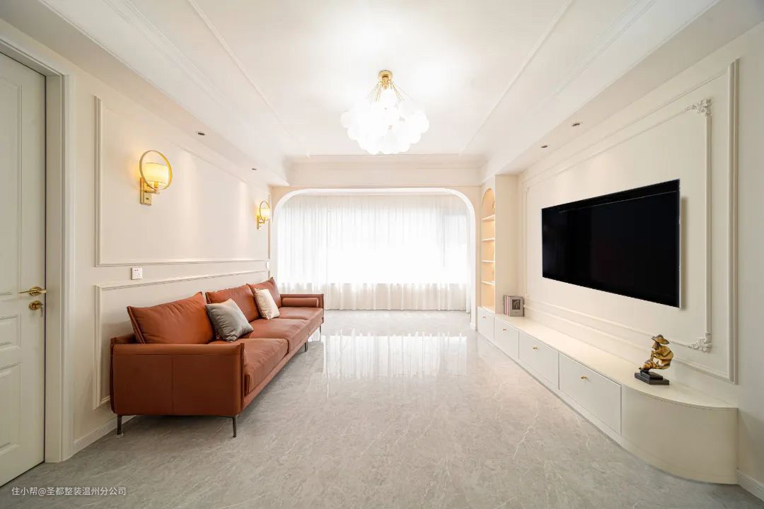客厅采用石膏线装饰,简约氛围的石膏线大大提高了客厅室内设计的格调,使客厅更有层次感和美感,爱马仕橙色皮质沙发不仅给人舒适的坐感,外观也给人奢华高端的感觉。 墙面涂刷了温柔的奶油色,pu线条做墙面造型,搭配上精心挑选的装饰,精致且浪漫,生活需要一点仪式感! 客厅有着天然的采光优势,阳台与客厅用拱形门隔开,进一步凸显空间尺度。透过柔和纱帘,阳光为空间打上一层柔光滤镜。 电视背景墙除了干净利落的线条修饰还搭配了精美的拱形壁龛,朱砂红和隐藏灯带的点缀,为空间注入别样的艺术美感。