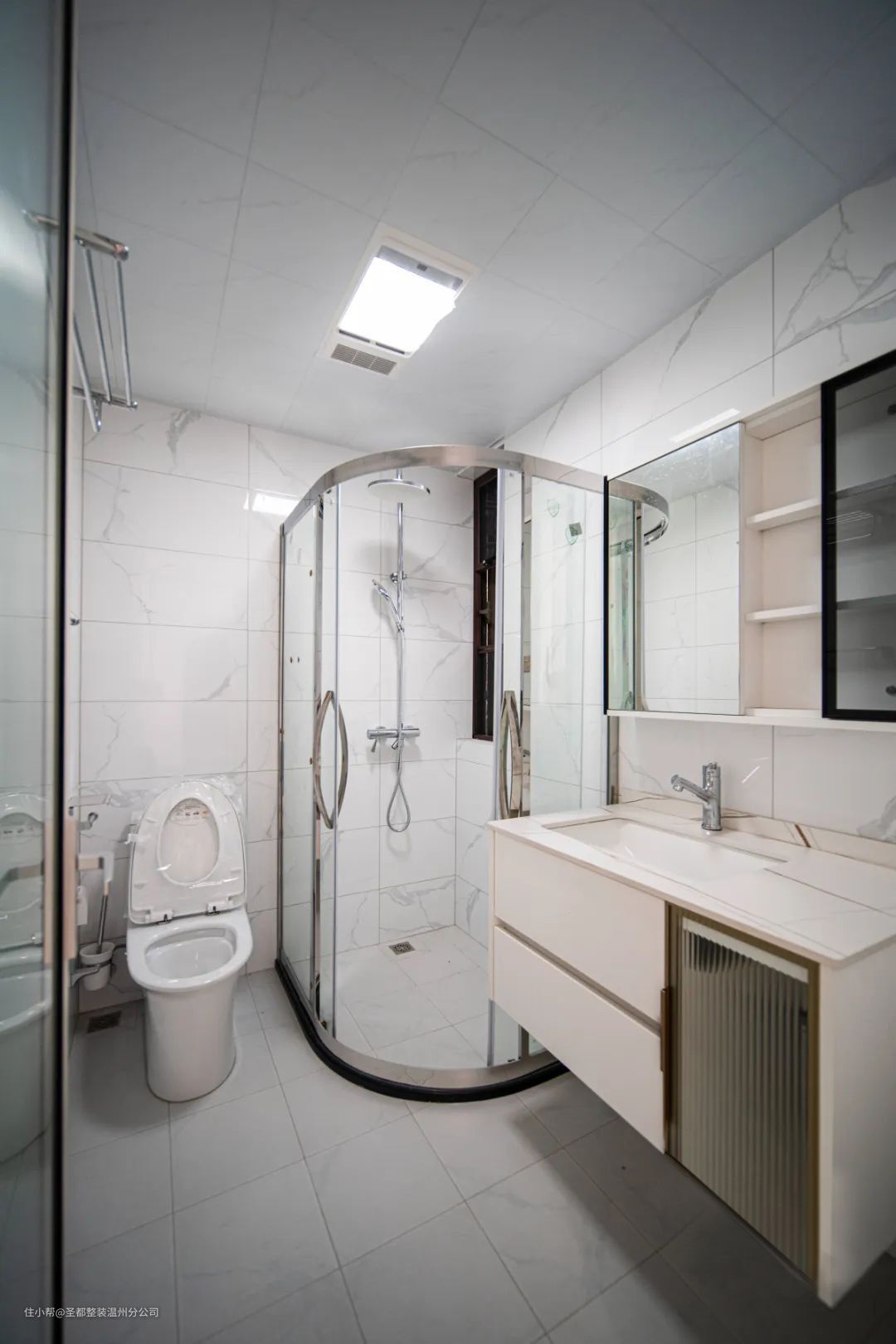 浴室利用淋浴玻璃室制作了简单的干湿分离设计。干区白色台盆搭配大理石纹理石材,奠定空间简约优雅基调,上方设立壁龛,满足日常的洗漱用品存放,下方的橱柜,避免东西的杂乱,营造整洁干净的氛围。