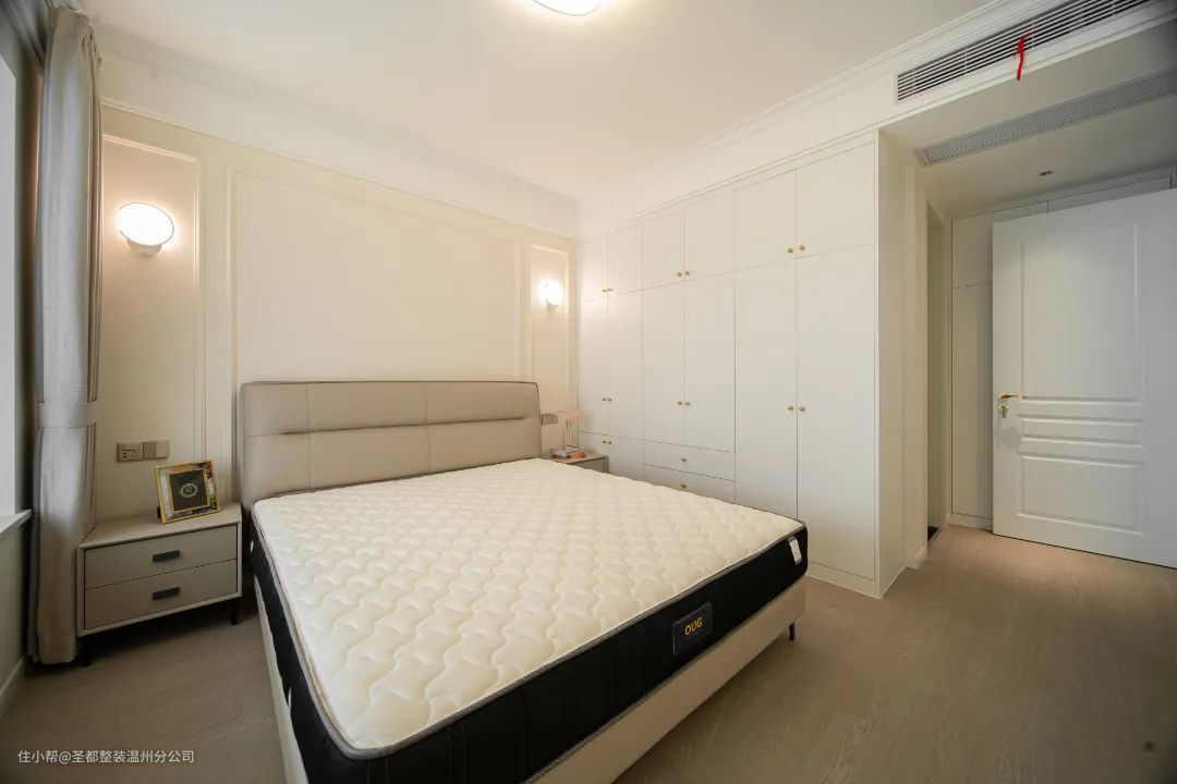 主卧延续奶油色系,优雅墙面上装饰精致PU线条,在床头吊灯的烘托下,呈现出丰富的视觉层次。双灯头床头灯形成对称光影,细腻地刻画了空间秩序,居室更显静谧优雅。 定制立顶橱柜,满足业主日常收纳需求,折叠区,挂衣区,抽屉区,分类整理衣物,功能性与美观性相结合