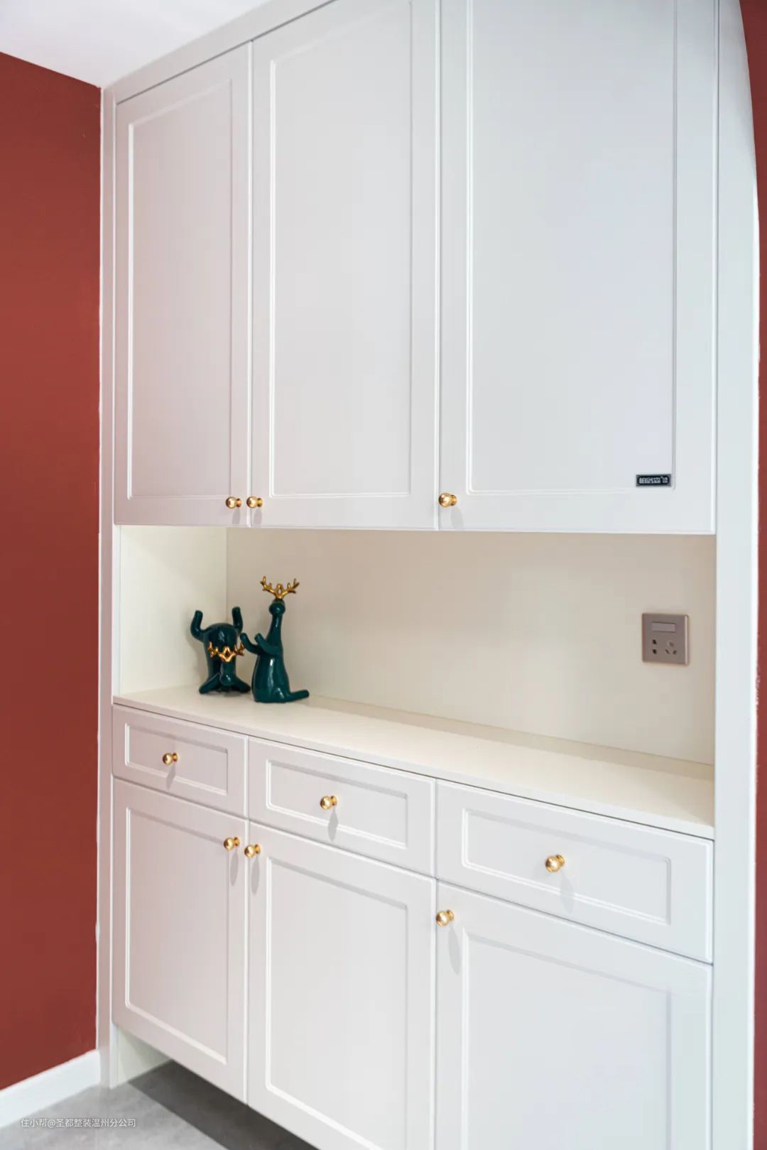 进门映入眼帘的是一整面墙的收纳柜,通顶的奶油色+朱砂红的融入,使入户就对整个家所期待。玄关右侧的法式拱形门,烘托着艺术的氛围,分隔了家的功能区。