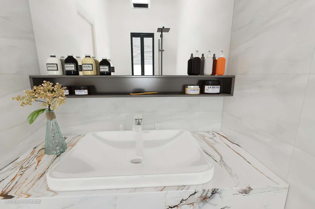 卫生间空间面积不大,没有做干湿分离设计,但是整体功能性设备都具备,梳妆镜根据墙面尺寸精确设计,整体设计感更强,台面选用的是花纹大理石,增加色彩感的同时,还打理;