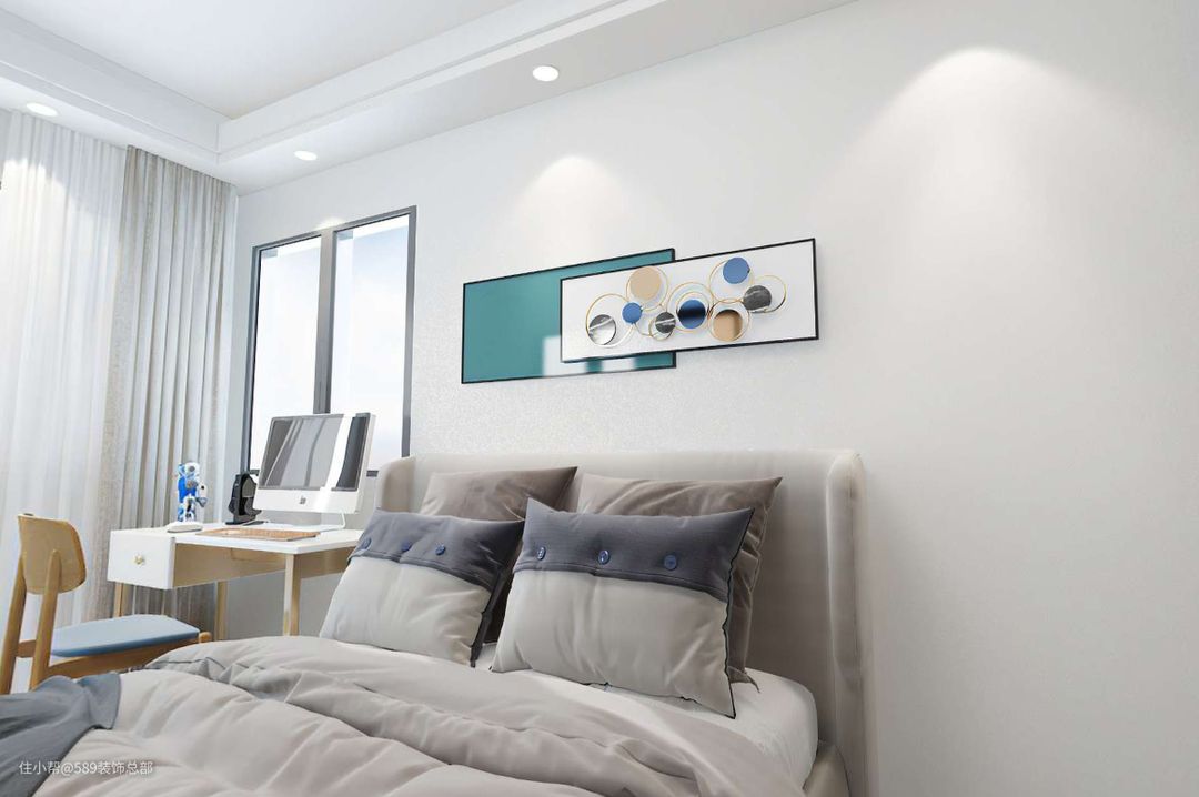 次卧整体空间不大,将阳台利用起来做书桌,也可以用作梳妆台,有着充足的自然采光,衣柜选用的是推拉门到顶设计,方便拿取的同时,整体感更强;
