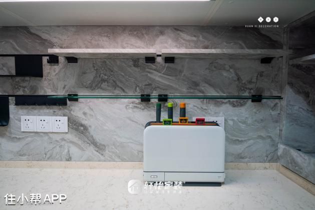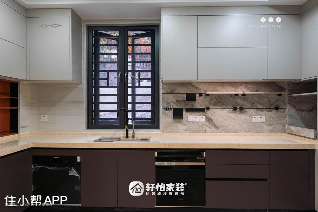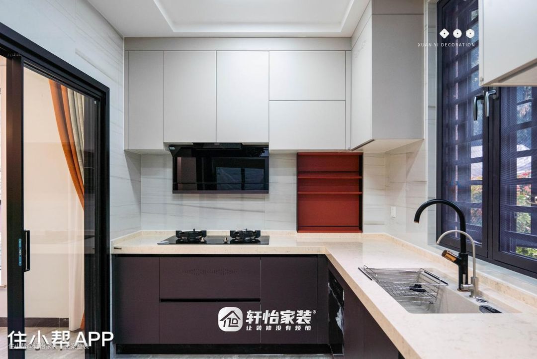 厨房的配色尤其大胆,白色收纳柜与橙色收纳格相衬,米黄、棕红相衬的操作台,都在表现着设计师配色的张扬有个性。“L”形的厨房,打造洗切炒一体的便捷生活动线,提高了厨房使用率。 洗菜台布置在窗户的下方,将窗外的美景尽收眼底,增加烹饪的乐趣。上吊柜与地柜组合设计,增加更多的收纳空间,让厨房空间更加简洁卫生。地柜做嵌入式蒸烤一体布局,为厨房节省出更多空间。 墙面的空间一点也不浪费,嵌入日常用品置物架,增加刀具收纳盒,让台面空间更加干净爽朗!采用嵌入式明火煤气炉,让空间利用达到最优化。