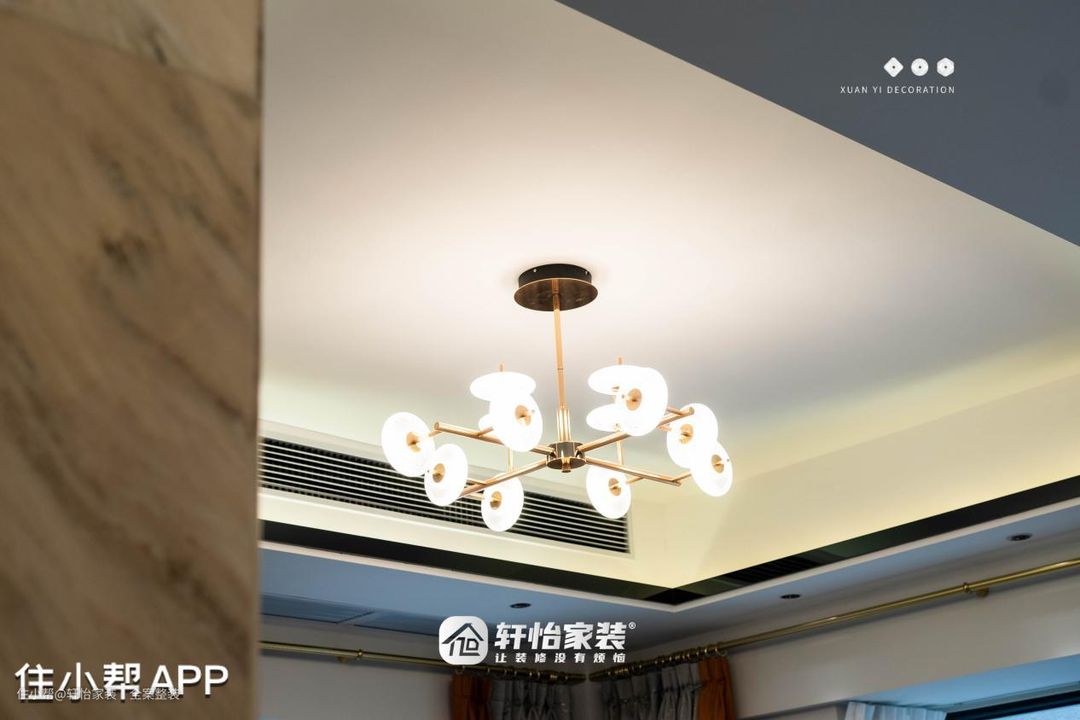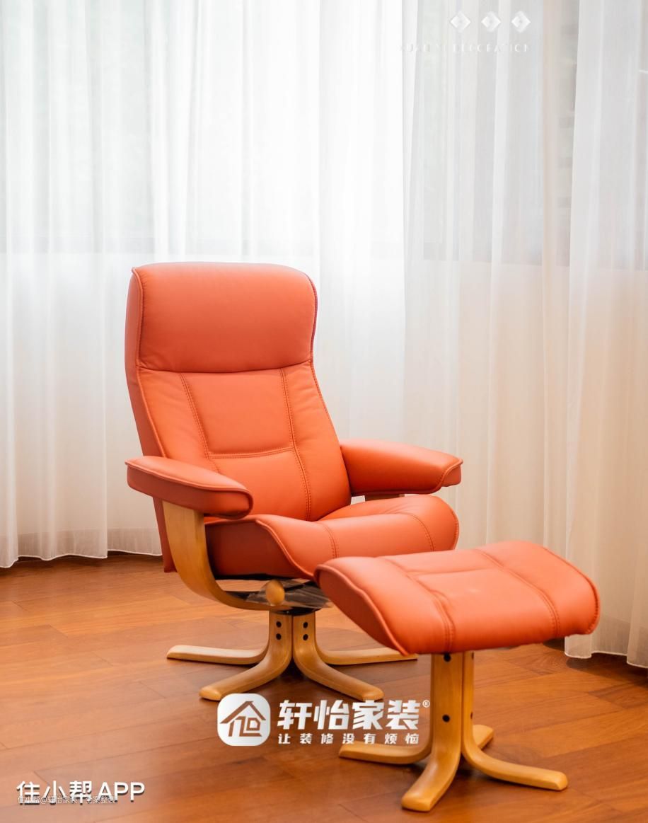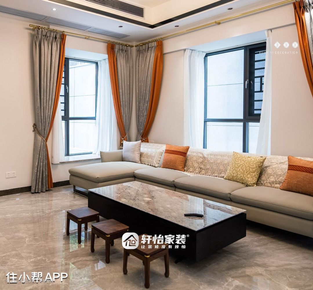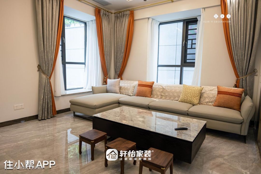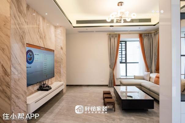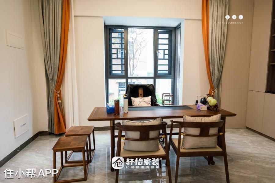 客厅空间从地板、沙发到电视背景墙主色调是浅灰色系,浅灰色系对空间色彩的包容度更高,空间高级感上体现的更充分。 凹形天花板搭配放射形吊顶灯,暖黄色灯光让整个客厅更加温馨,采用主灯设计,让客厅更加明亮通透,轻奢风的细节处理被设计师拿捏得非常得当。 从入户到客厅,窗帘从材质到配色都保持了风格的协调统一。落地窗用纱帘保护日常居家隐私,搭配银色+橙色落地窗帘,银色与空间灰色系搭配,橙色让空间更加活跃。 凹形电视背景墙采用是时下流行的岩板材质,光泽度和质感上更胜一筹!底下打造三抽白色抽屉,用金边作为装饰,整体更加简洁大气,美观与实用性能兼得。 沙发背面打造了两个飘窗,增加客厅采光的同时,还提升了客厅的通透性,既方便空气流通,还能观赏外面的景色,让家更贴近自然,有了更多人情味。 客厅保留传统茶几布局,岩板材质搭配矮脚木凳,与灰色皮质沙发自成一体,在橙色、金黄色抱枕的点缀下,犹如轻奢风融合了新中式的韵味,让空间设计语言有了更多的表达形式。 采用棕色木制桌凳,让茶室的茶韵味更加浓厚,椅子搭配靠背垫,休闲品茗更加舒适,让客厅和茶室空间足以满足更多不同的生活需求。 客厅与茶室对望,闲暇时约上三五好友品茶谈笑,就是人生最大的享受呢!