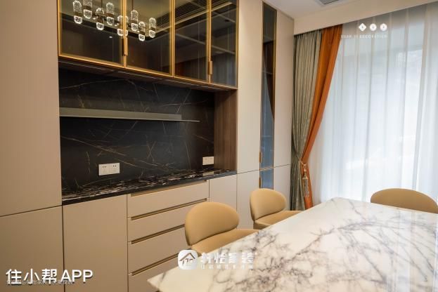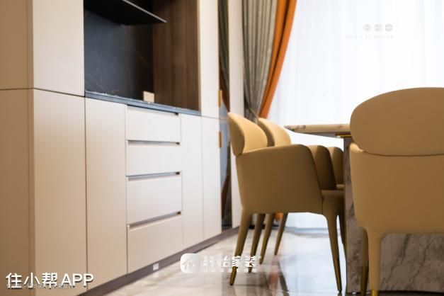 整个餐厅,最引人注目的要数餐边柜和落地窗的设计,视野宽敞明亮,格调大气典雅,让日常用餐多了几分情调。加上落地窗将视觉延伸到室外,室外的风景也成为了餐厅空间的一部分! 餐厅的餐边柜设计引人入胜,开放格+隐蔽收纳柜+玻璃透明收纳柜设计,多元储物空间,满足装饰和储物的多种生活需求,设计感满满。 飘窗拉上纱帘则给空间增添了一丝柔美,配上长形吊顶灯的黄光照射,让人真正感受沉浸式用餐体验。岩板材质的餐桌,具有耐磨、耐油污的优势,同时在质感上更胜一筹,是居家餐桌的好选择! 浅色系岩板搭配餐椅,选择性空间更大,姜黄色餐椅给空间的视觉加分,在灯光的衬托下,显得更加柔和静谧,让人舒缓放松!