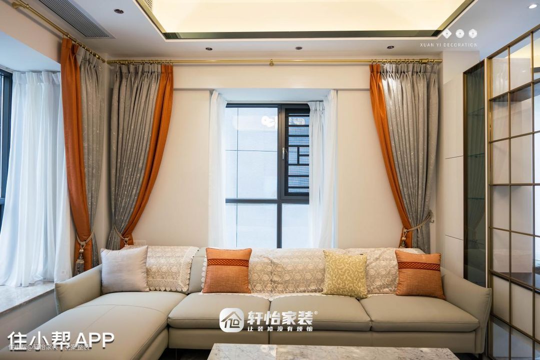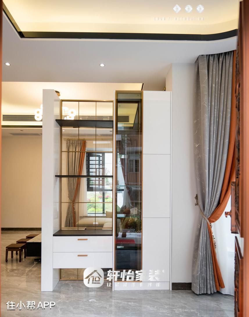 为了隔断住宅隐私,入户增加了玄关保护隐私,玄关柜采用开放格设计,中间加上了玻璃格栅式样的屏风,避免入户直面客厅的尴尬,不管是从外到里还是从里到外,视觉始终保持若隐若现,增加房子的神秘感,同时又提升了玄关柜的设计感。 玄关空间较为宽广,还保留了大面积落地窗设计,搭配白沙和撞色窗帘,与金属材质花纹的大门相呼应,既保持了风格的统一,又各有特性,低调轻奢质感从进门那一刻就能感受到。