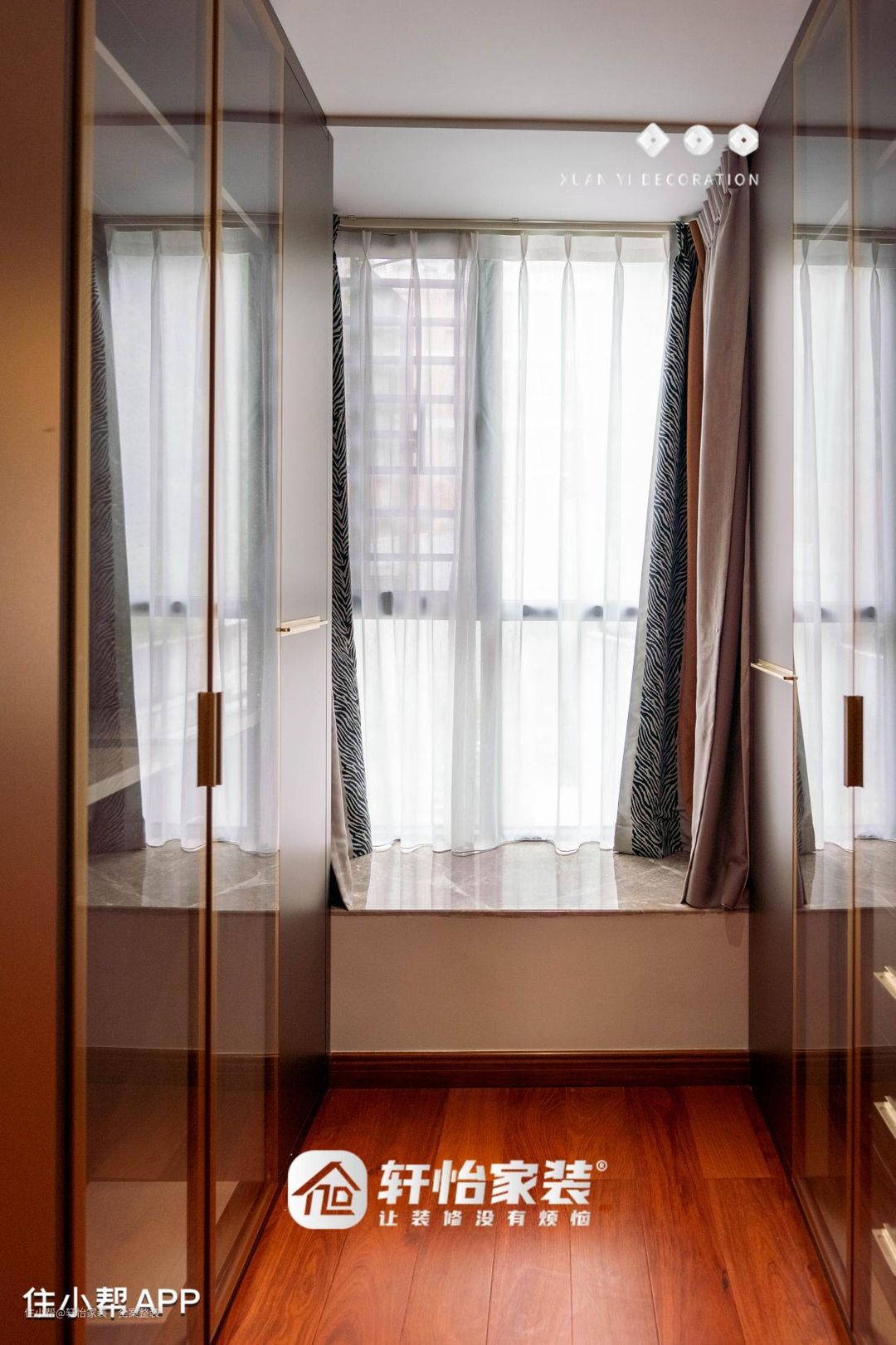 大落地窗是整个主卧空间的加分项,所以设计师在软装颜色的选择上也更加得心应手。明黄色的床头+同色系床头柜子,在明亮光线的映衬下,给沉静的空间赋予生命力。 简洁大气的木质床头背景墙和整面到顶衣柜,在金边条纹的装饰下,更显娇气,每一个细节处理都体现了轻奢风的精准把握 方正空间的优势在整面定制衣柜的衬托下就更加明显了。整面墙到顶设计的立体衣柜,储物空间更加充足,中间采用玻璃面板,强化视觉的延伸。 设计师在主卧的另一侧空间进行留白处理,一把休闲椅+脚垫,在唯美的纱帘中轻轻摇曳,好一幅“云淡风轻近午天,傍花随柳过前川”的午后春日既视感。 转角步入衣帽间,依旧保留了另一个飘窗,为整个衣帽间增加更大的光源。白纱窗帘拉下,氛围感十足,还能提高衣帽间空间的私密性。 主卫采用流行的干湿分离设计,墙体通铺白色花纹大理石瓷砖,搭配断桥铝窗,保温防水防盗功能更显著。 铺贴白色瓷砖的洗手台,底下添置了隔板收纳,日常用品有了收纳空间,让卫浴空间更加干净整洁。坐厕上放安置白色多功能挂物架,方便日常洗漱用品收纳。