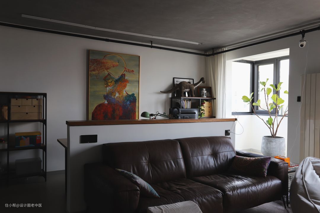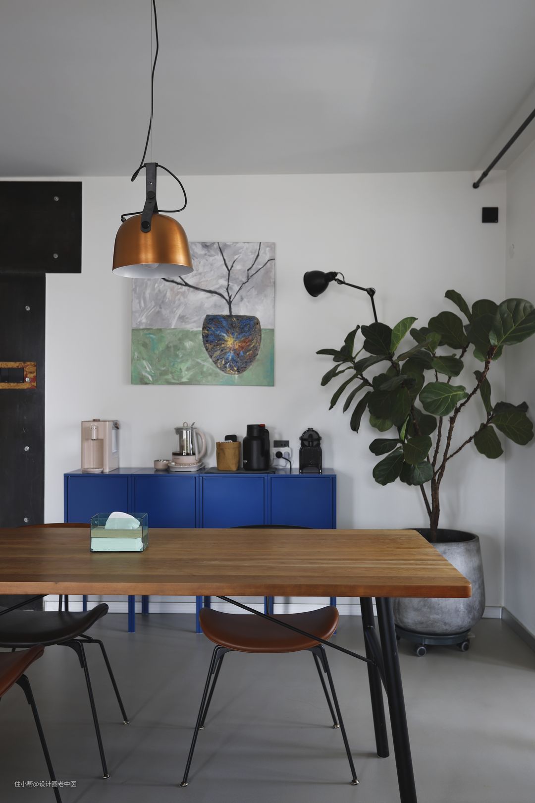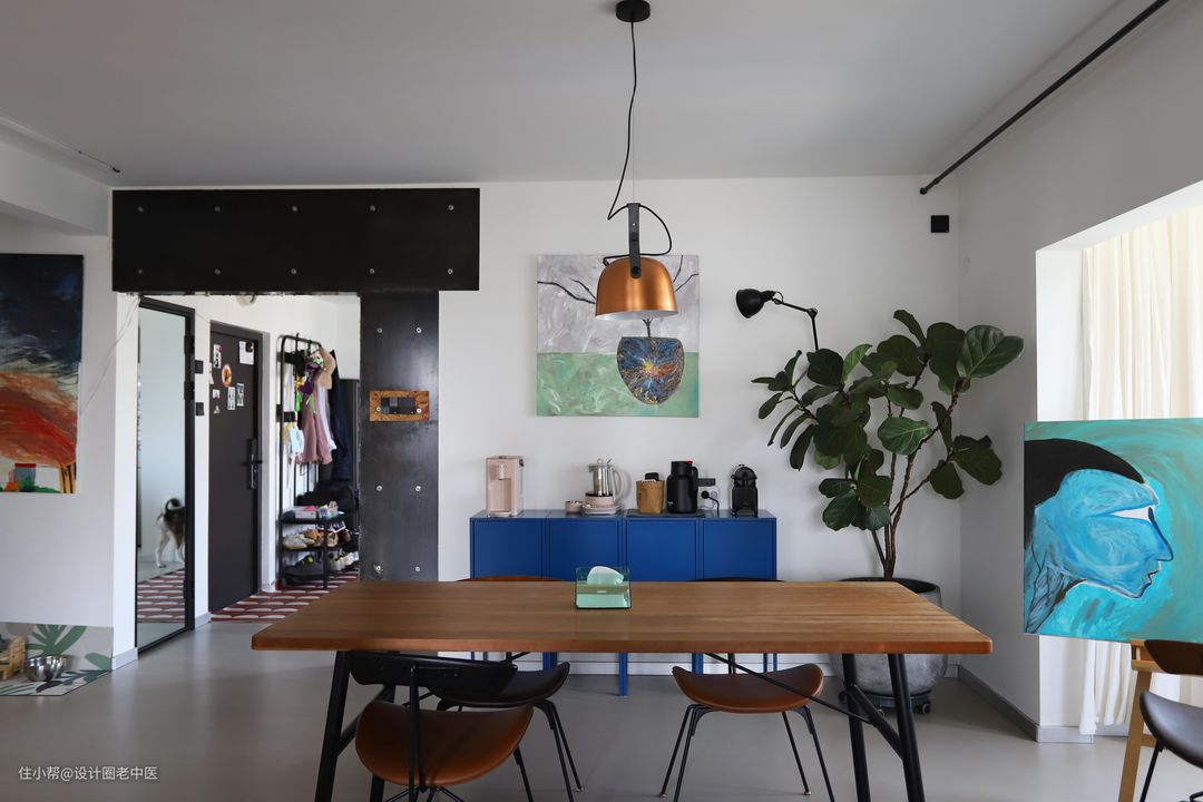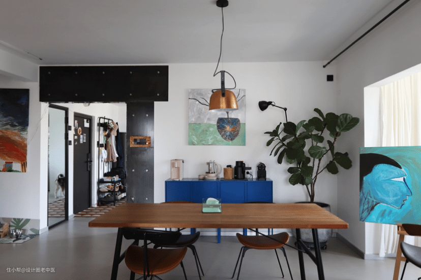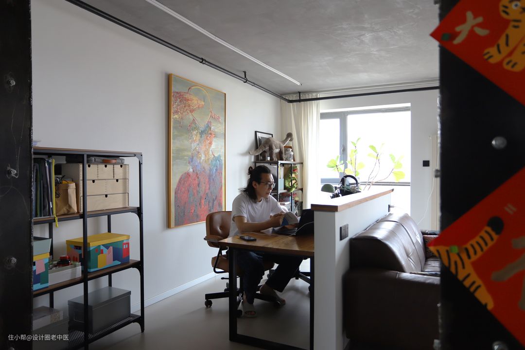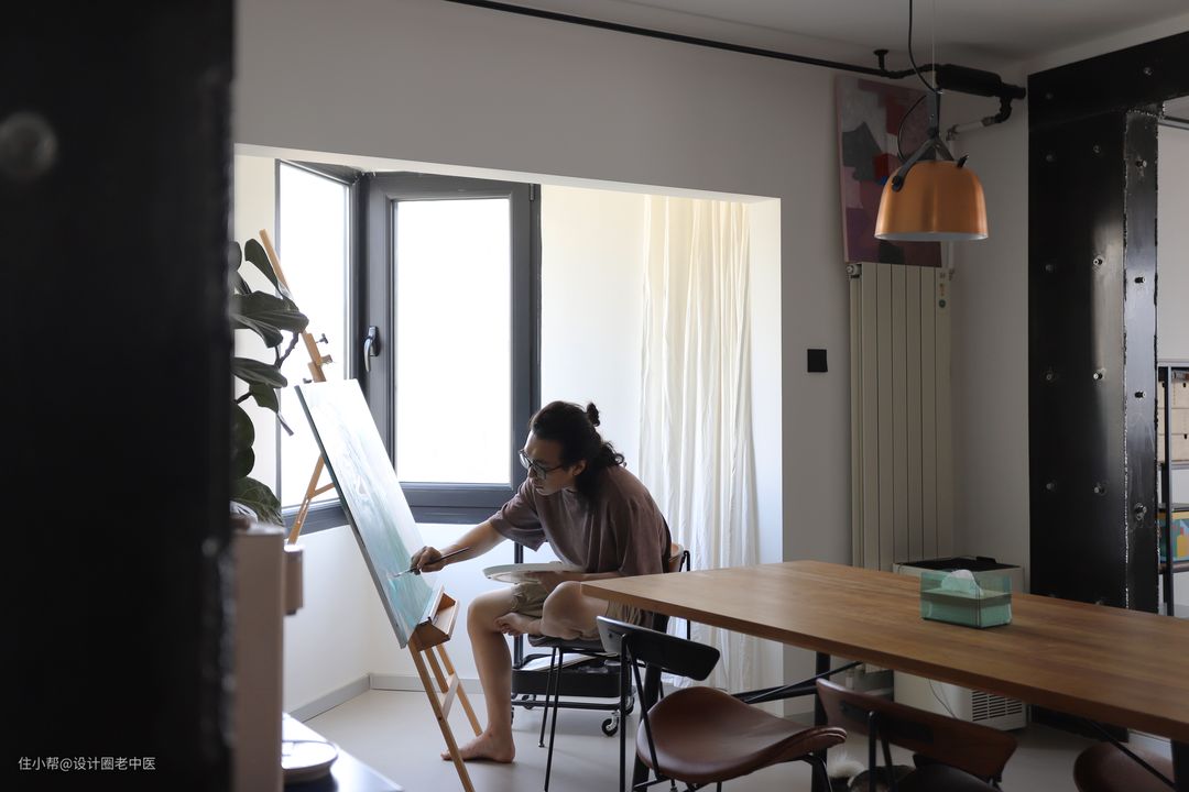 餐厅所在位置是原来的客厅,相比于原来的餐厅,不仅宽敞,视野更好了。 他家全屋做的水泥自流平,夏天的时候他们还挺喜欢光脚在家走的。 自流平整体效果还是非常好的,就是对施工的要求比较高,如果各工序环节衔接不到位的话,还是有开裂风险的。 右侧顶上是暖气管刷的黑色金属漆。 男业主喜欢画画,餐桌边的异形小阳台就是他的画室,家里墙上挂的装饰画,基本都是男业主亲手画的。