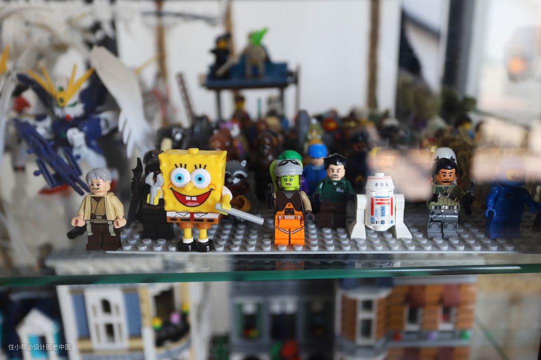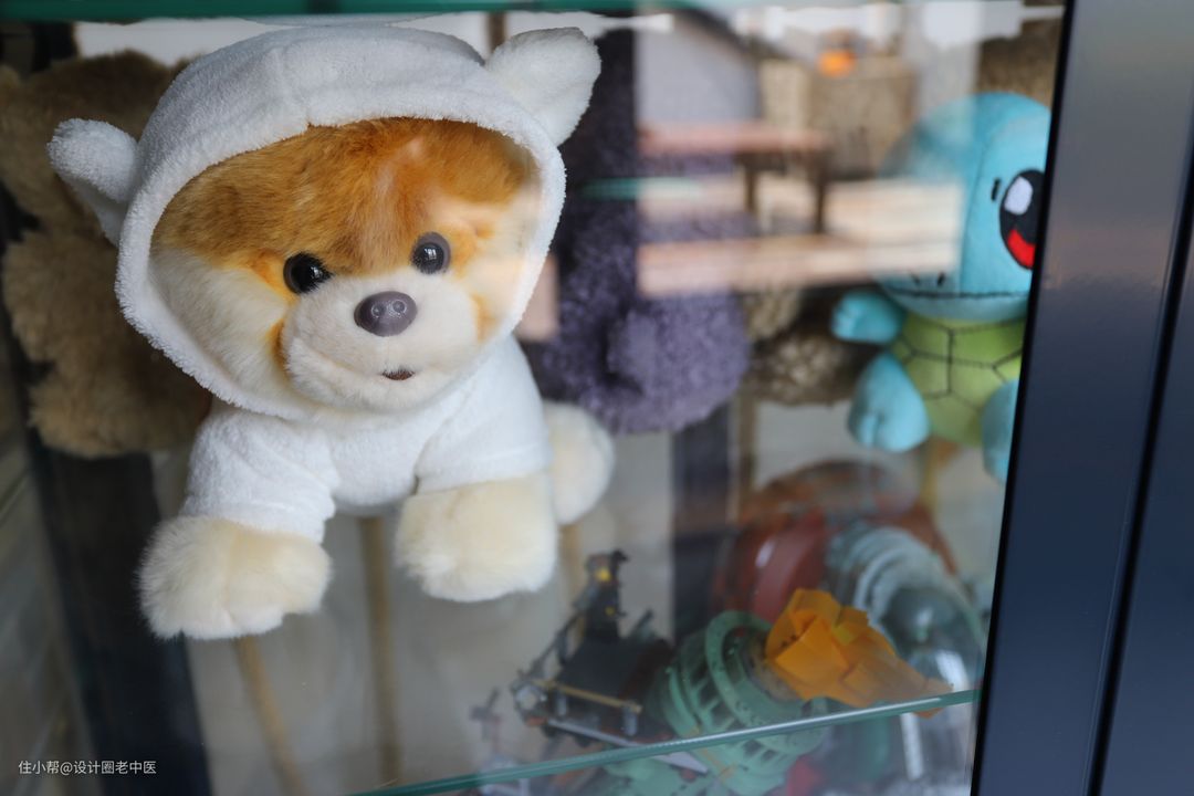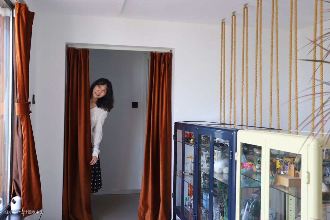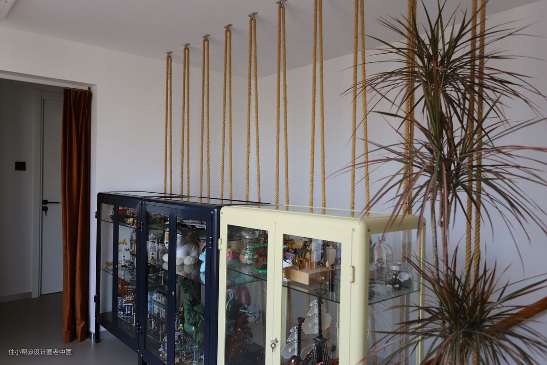 上了二楼是一个比较宽敞的过道,整个二楼作为休息空间,往右是主卧和衣帽间,往左是家政区和卫生间。继续往前走推门出去就是一个大露台。扶手是用麻绳做的,对折后固定两端,排成一串,有一种自然的亲近和通透感。 沿着过道是三个半高的展示柜,是金属加玻璃的材质,里面是他们喜欢的手办乐高还有旅行途中收集来的藏品。