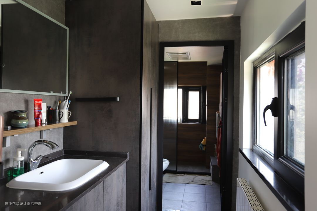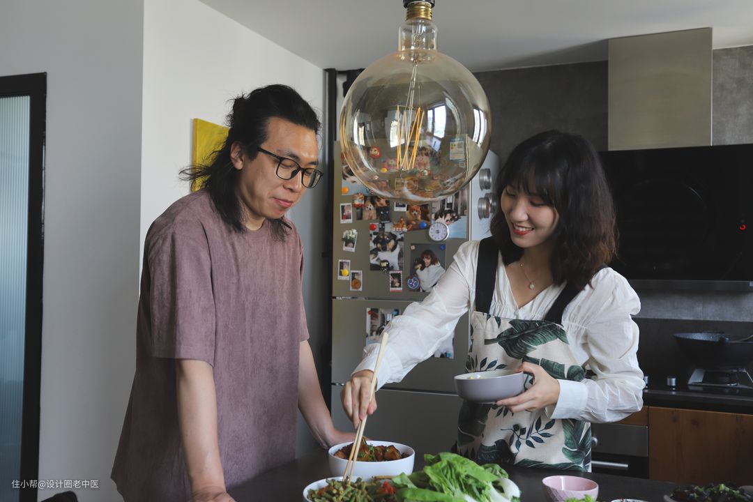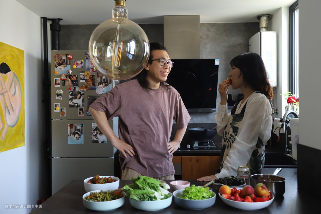 他们还是比较喜欢下厨的,原来的厨房不大,又是L型布局,很难满足他俩的需求。我们拆了原厨房隔墙,把餐厅也并作厨房的操作空间,实现超大收纳的F型布局。F型上半段是中厨主要操作空间,下半段主要是储物和小家电区。 厨房设备和窗户占了大部分墙面空间,就没有做吊柜,不过地柜的储物量已经完全可以满足他们了。 虽然是开放式厨房,做饭频率也高,但业主两年多使用体验告诉我们,只要买个大吸力的烟机,卫生还是很好打理的。