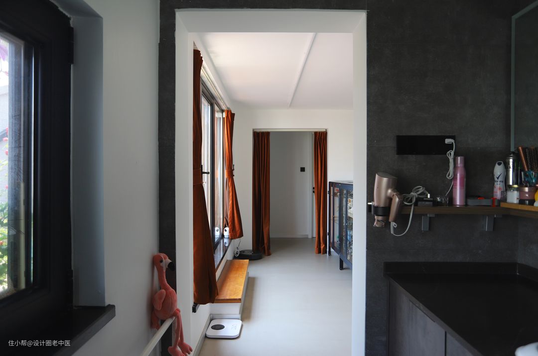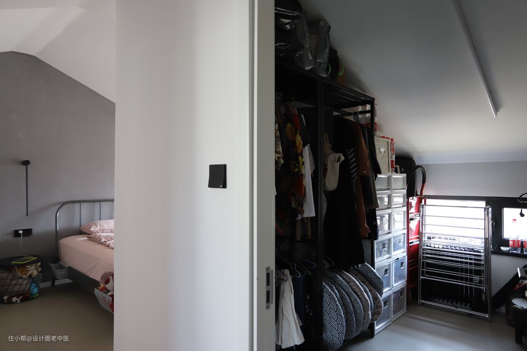 卧室是没有装门只装了布帘,主要就他们俩住,也不存在干扰隐私的问题。 阳台垭口的半高墙全部拆除,床头背景墙整体涂刷了艺术漆,和客厅的顶面是一种材质,这样形成一个深与浅的对比,会更有层次。 二楼原来的次卧改成了衣帽间,就在主卧旁边,换衣服也很方便。衣帽间的门洞改到了右边,这样不会一上楼就看见衣帽间。