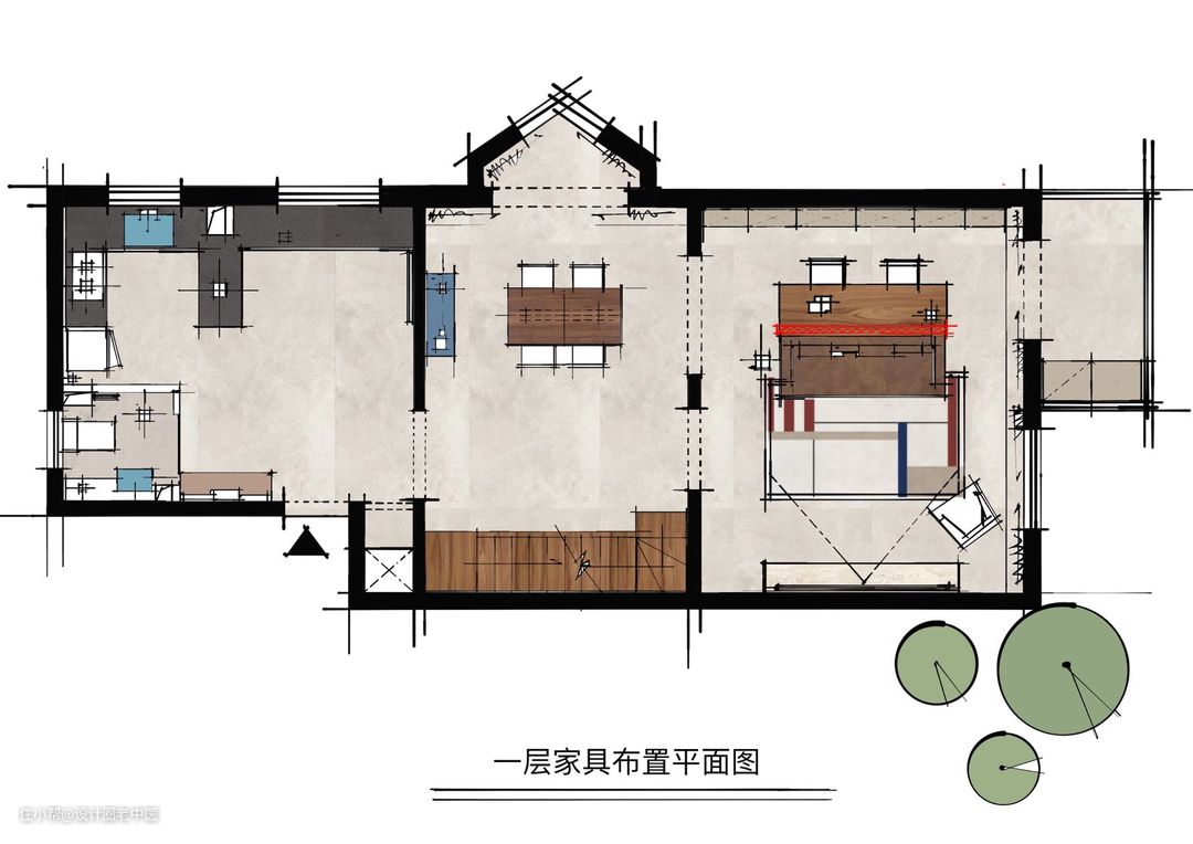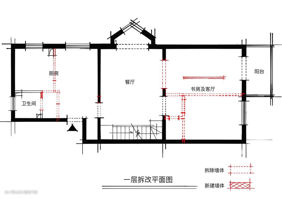 户型分析: 1.房子原始格局还是很不错的,就是不太符合他们的居住要求 2.原格局客厅夹在房子中间,采光有点不好 3.二楼卫生间门口区域比较浪费 户型改造: 1.把四居两厅格局改成了一居三厅 2.一层卧室空间合二为一,围绕新建矮墙形成客厅与办公区 3.打通厨房和原餐厅,F型布局集合中厨与西厨,操作空间倍增 4.缩小一层卫生间,把更多空间给入户储物 5.二层把两个卧室合成一个主卧套衣帽间 6.卫生间水盆外置,实现干湿分离 7.敞开式观景露台