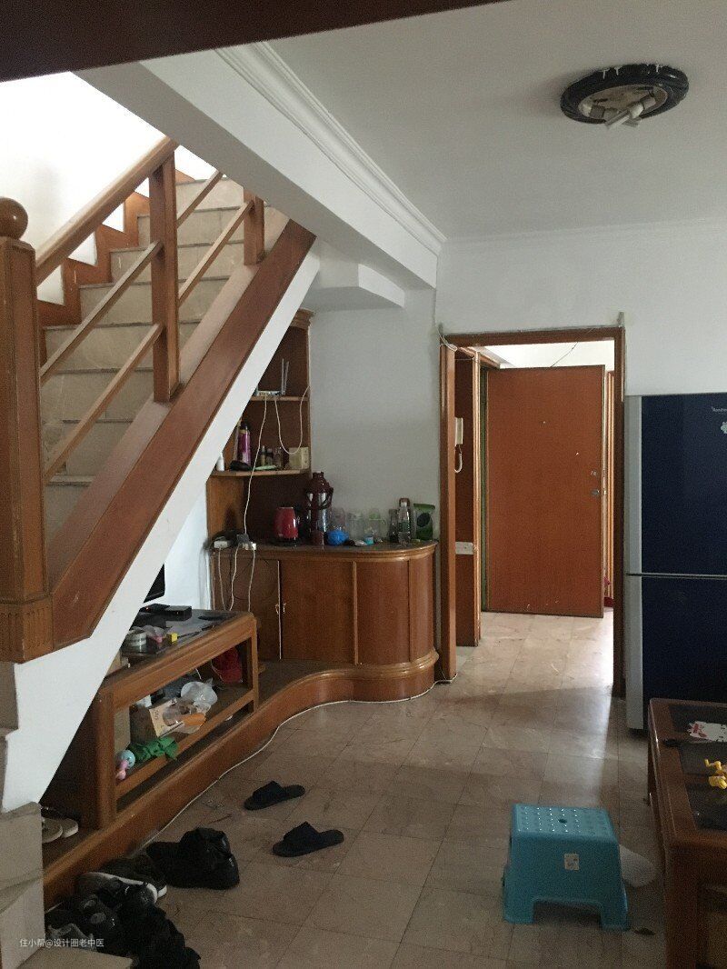 他们家就俩人住,一楼整个作为公共空间,卫生间满足基本功能就可以了,不用太大,所以就缩小了卫生间,把空间让给了相对来说更重要的入户收纳,没有做定制柜,而是选了一款鞋帽一体的挂衣架,通透又便捷。 原始结构入户左边就是一个小杂物间,相当于一个800库,过季的鞋、小推车、行李箱这些都可以收纳在里面。由于位置的特殊性,又想弱化存在感,就直接在门上装了镜子充当入户的穿衣镜,算是一种障眼法吧~