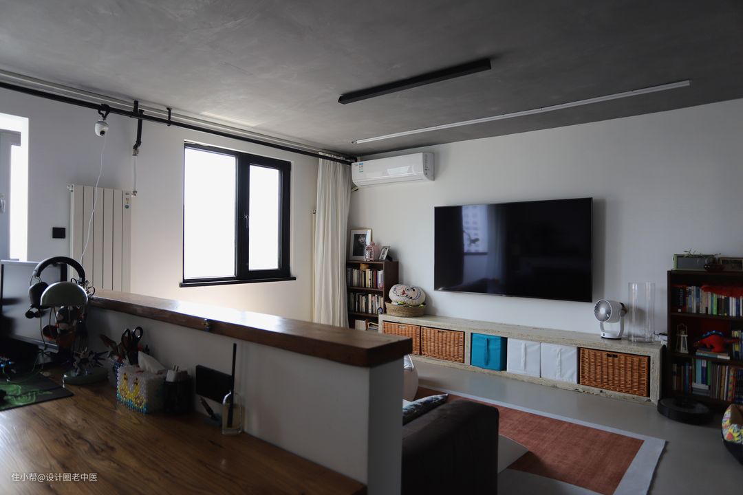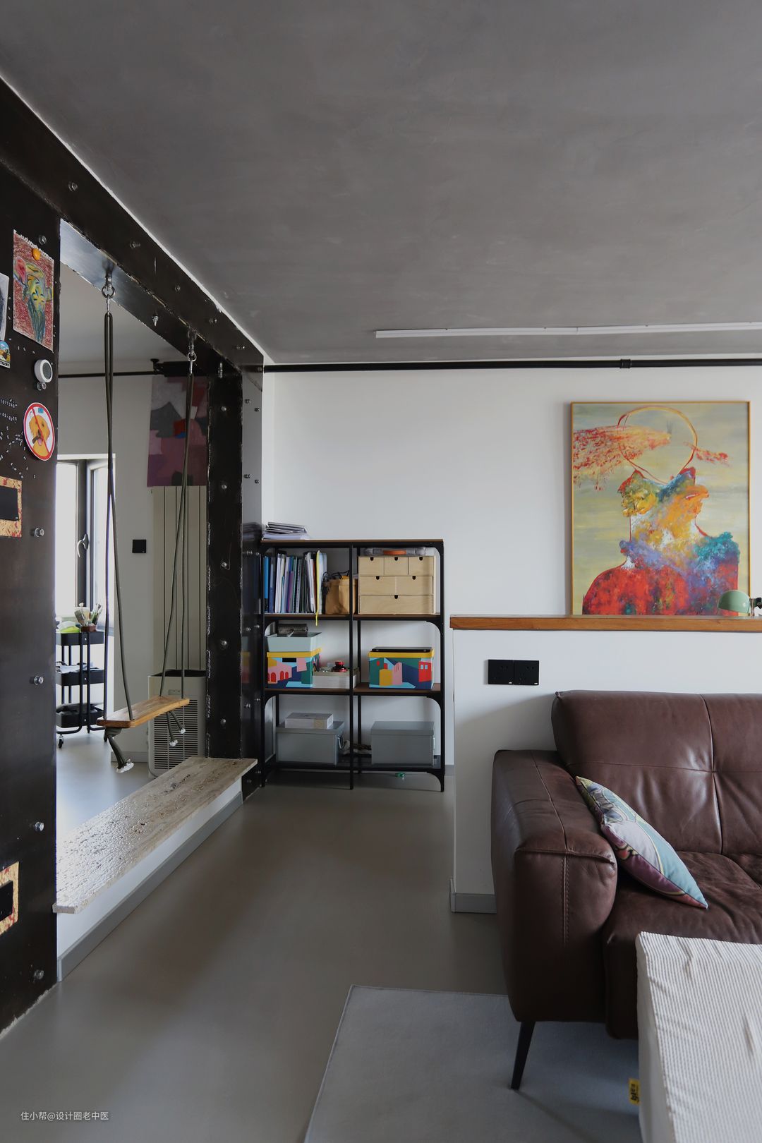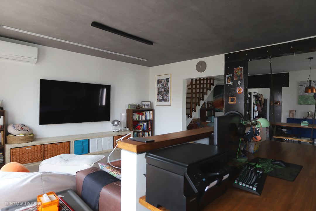 客厅是他俩平时待的时间最多的地方,把原来两间卧室打通,合为客厅和办公的区域。中间新建半高矮墙,既可以作为沙发的背景墙,也可以作为办公区与客厅之间的软隔断,四周都有过道,方便通行。 电视柜是直接水泥砌筑的,杂物都放在收纳篮里,低成本又美观好用。 金属钢板当初最主要的作用其实是墙体加固,不过施工过程我们双方都觉得裸露出来还是蛮酷的,就没有包裹,只做了防锈处理。 秋千是他们入住后装的,能在自己家里荡秋千,不要太爽哦~