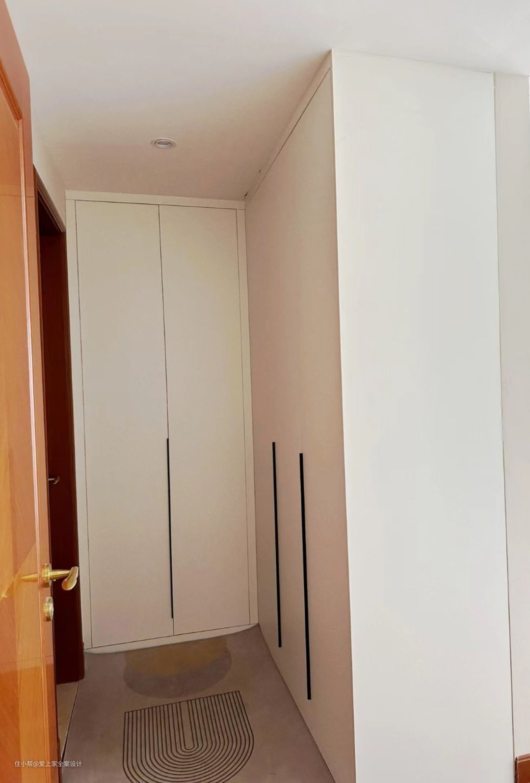 主卧的墙面,我们通刷了奶咖色的乳胶漆,非常的温馨,且很有质感。并且入户门我们做了小型衣帽间的设计。既节约空间,又非常实用。