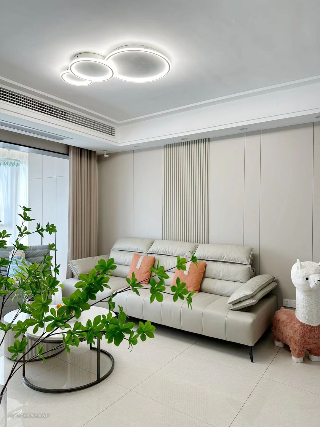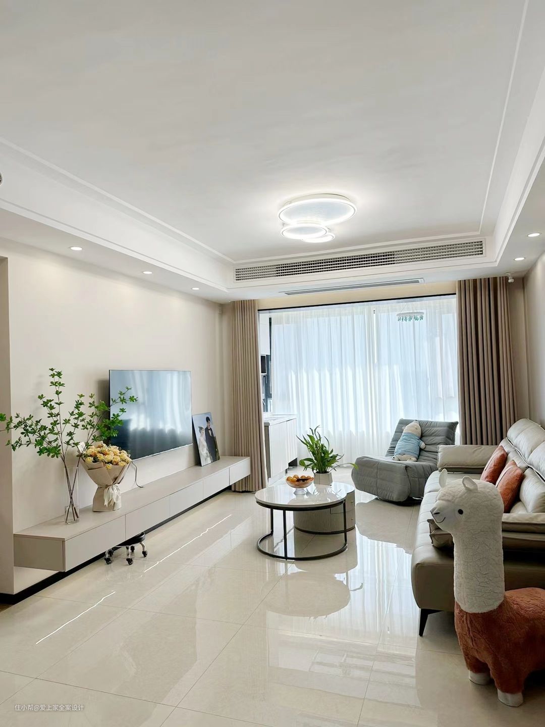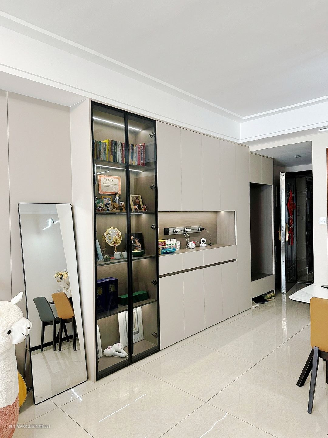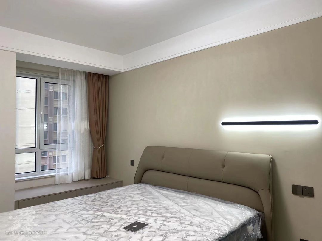 客厅和阳台选择通铺800×800的瓷砖,整体通透明亮;我们做了封阳台的设计,并且搭配上白色窗纱,非常的轻盈和有质感。 客厅的墙面通刷了奶咖色乳胶漆,筒灯照射在墙面上,形成光影的造型,非常的浪漫和梦幻。电视柜我们做了悬空的设计,底下留有30cm的余地,方便扫地机器人进出,没有清洁死角。