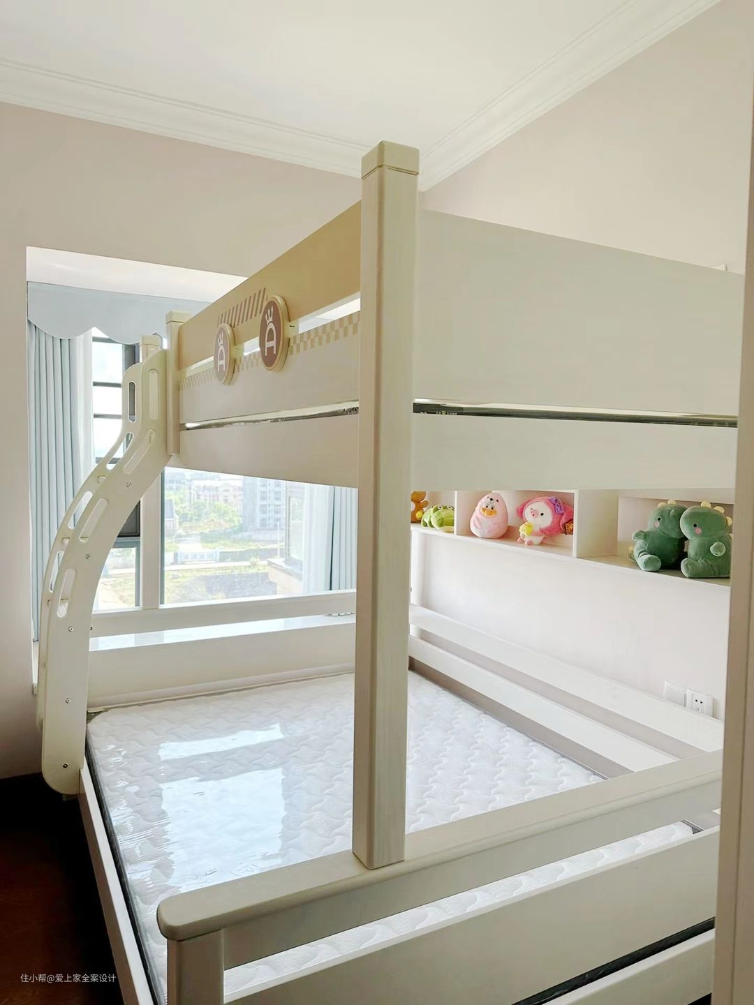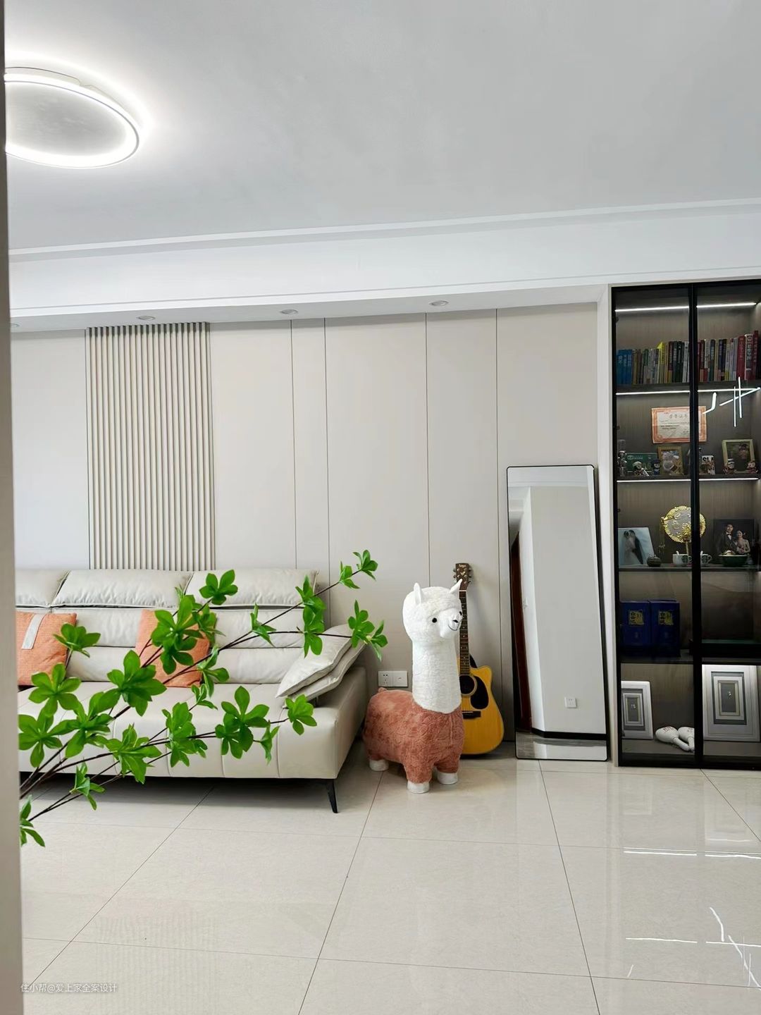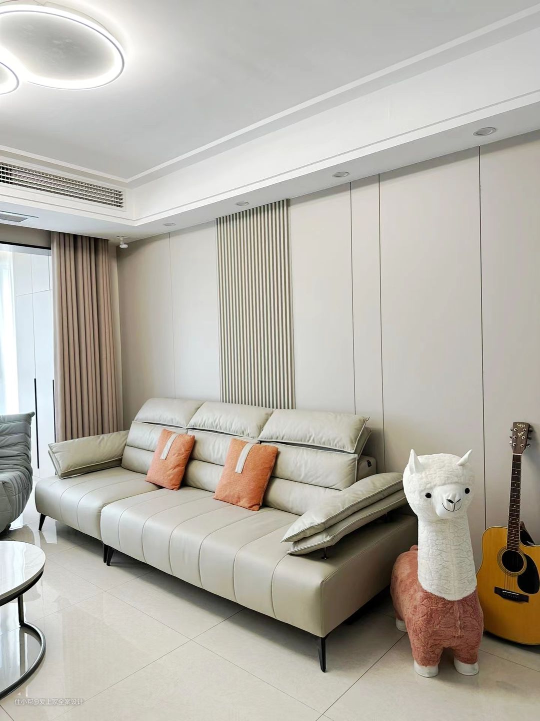 客厅和阳台选择通铺800×800的瓷砖,整体通透明亮;我们做了封阳台的设计,并且搭配上白色窗纱,非常的轻盈和有质感。 客厅的墙面通刷了奶咖色乳胶漆,筒灯照射在墙面上,形成光影的造型,非常的浪漫和梦幻。电视柜我们做了悬空的设计,底下留有30cm的余地,方便扫地机器人进出,没有清洁死角。