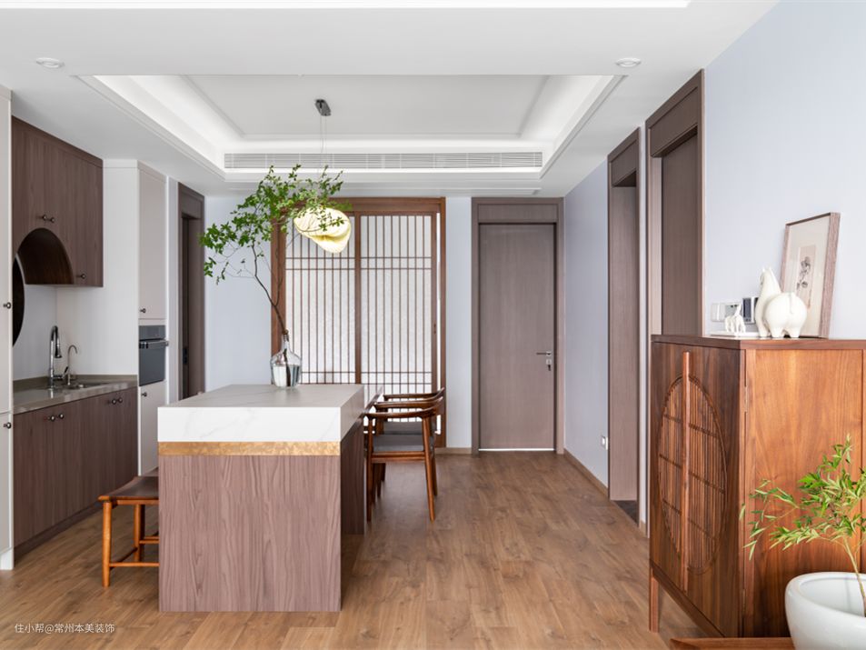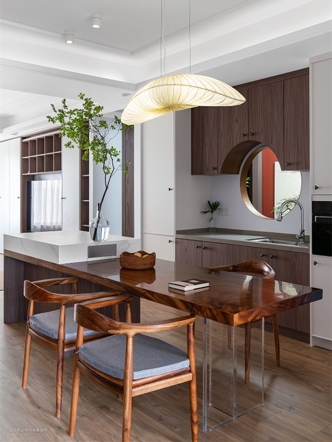 岛台中间使用了一整块原木台面作为桌子,营造出休闲轻松的氛围。为了支撑台面,设计师使用了亚克力桌角作为辅助。这种设计美观实用。