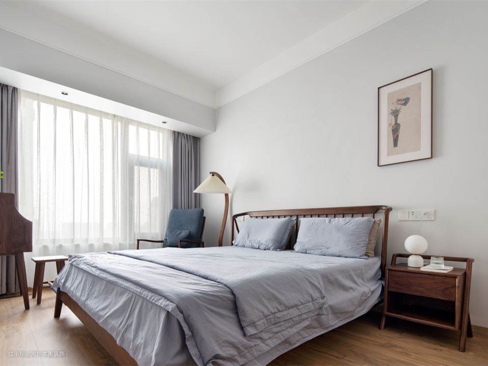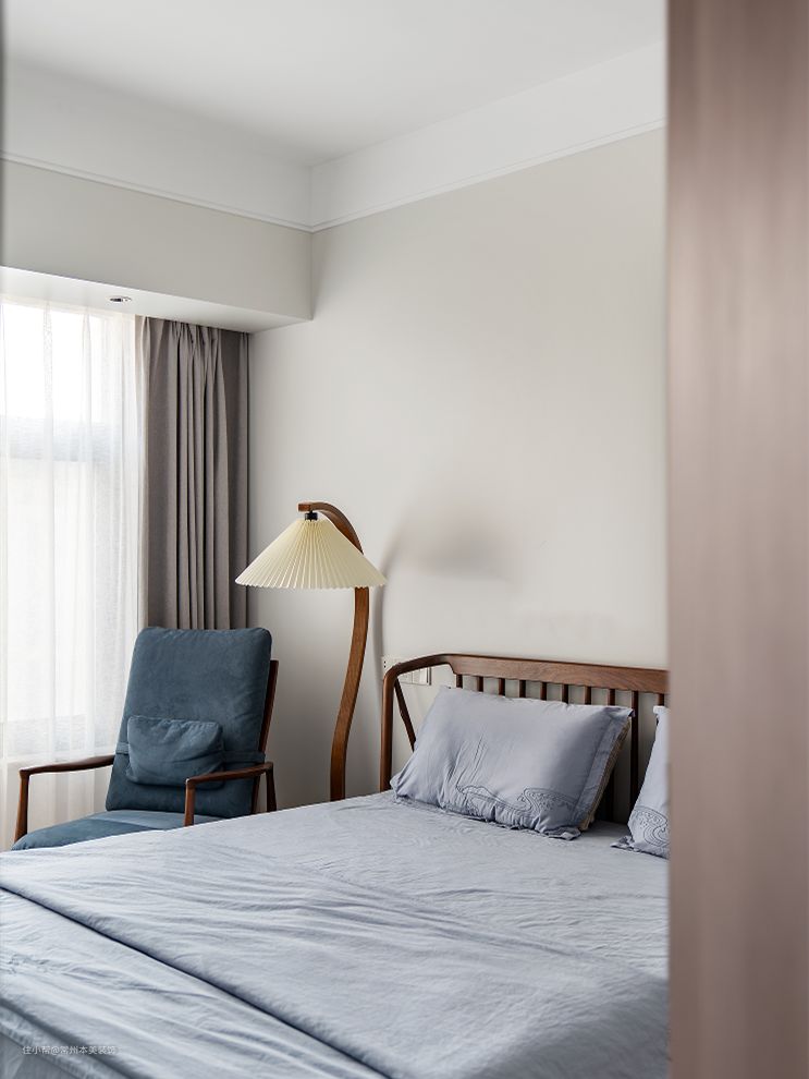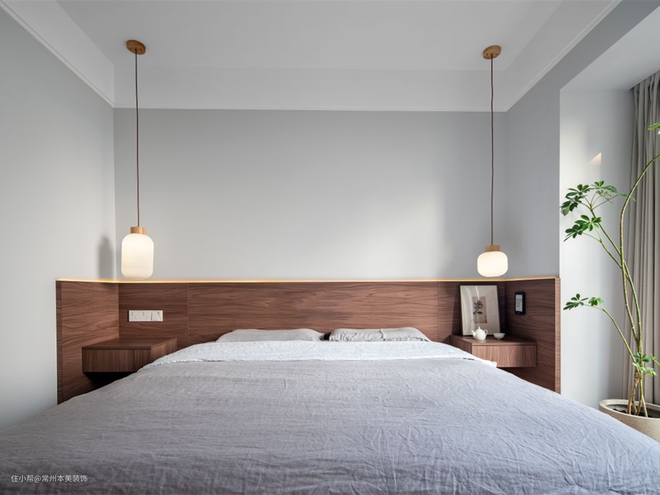 北欧风格和日式风格的结合是一种非常流行的室内装饰风格。这种风格以简约为主,同时也非常注重舒适和实用性。选择白色作为背景色是非常常见的,再加上棉质的床上用品,能够让整个居室显得非常的温馨。莫兰迪色调的窗帘进行点缀,这将会让整个卧室空间看起来非常的高雅和大气。