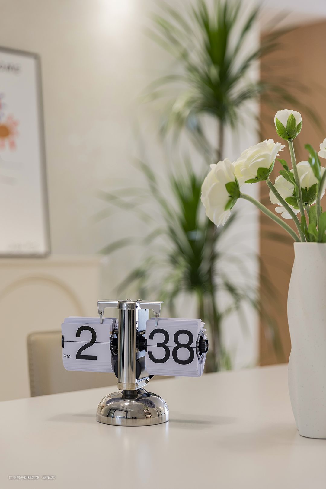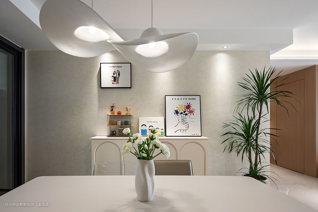 开放式的餐厅依旧秉承舒适简约的理念,白色与米色相融,为空间增添温润优雅感,表现出了温柔而又治愈的力量。 空间采光用到了时髦造型的吊灯+筒灯设计,风格简雅同时不会影响层高,空间视觉效果也更开阔。 白色原木餐桌椅将温暖与情怀倾注,晶晶特地选了应季的的小白花,生机盎然,倍增用餐时的气氛,靠墙处的餐边柜摆放了画册或工艺品等作为装饰功能。 餐厅通往卧室的过道采用了拱形门设计,以n型的视角望向餐厅,大型的龙血树和涂鸦装饰画自然形成绝美画面,轻松营造出清新放松的居家氛围。