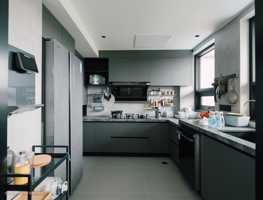 厨房空间选择灰色瓷砖及同同色系橱柜样式,通过视觉上的色彩差异又和谐统一,形成感官上的落差,营造出更有层次感及秩序感的烹饪空间。