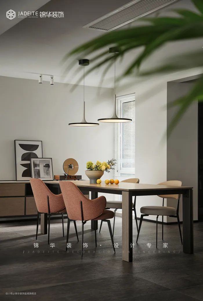 浅灰色的木质餐桌搭配灰粉色布艺及米加色的皮质餐椅,融合黑色的金属壁炉与彩胶唱片机……不仅创造了感官的丰富度,增加了就餐的浪漫温馨基调,也使得环境氛围达到沉稳又有生气的美妙平衡。
