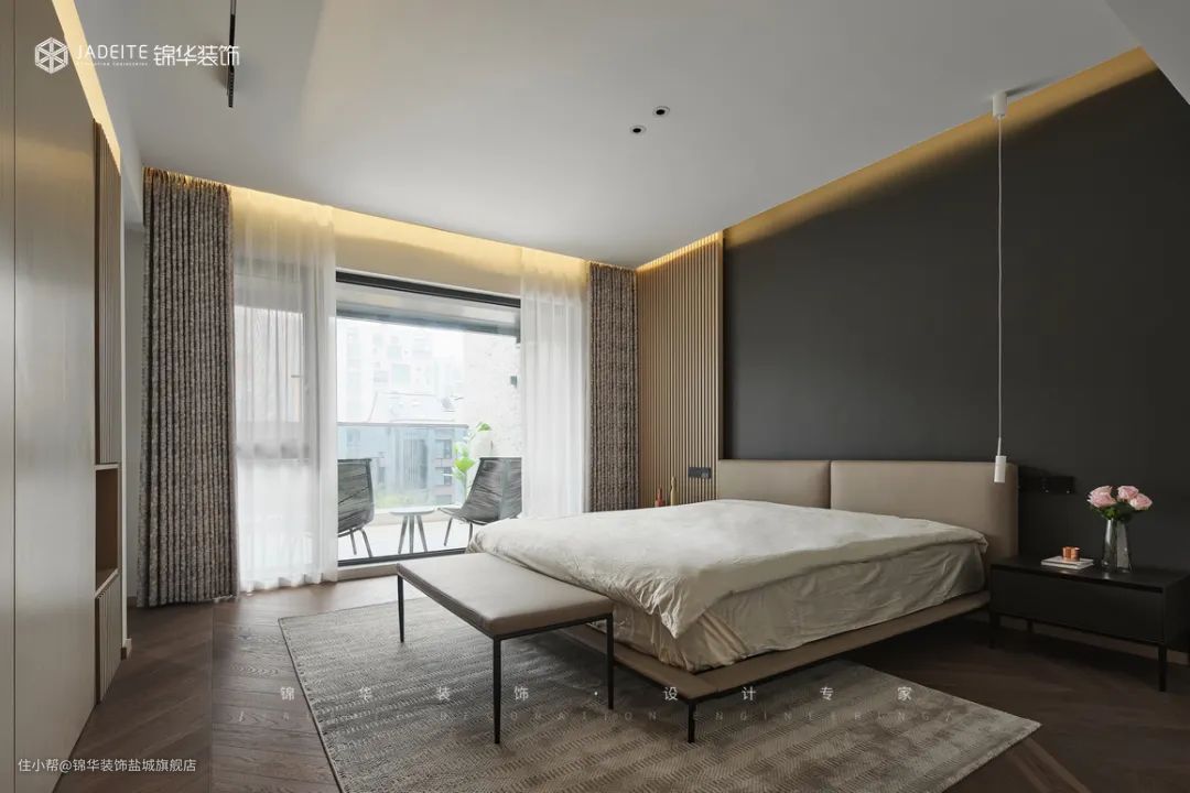 木色温润自然,承接室外露台的自然气息,床头黑色艺术漆和黑色床头柜的融入,让自然与时尚相互交融,营造清雅安逸的氛围。木地板的温度延伸到壁面(柜子)及墙面的手法,呈现空间的包覆感。