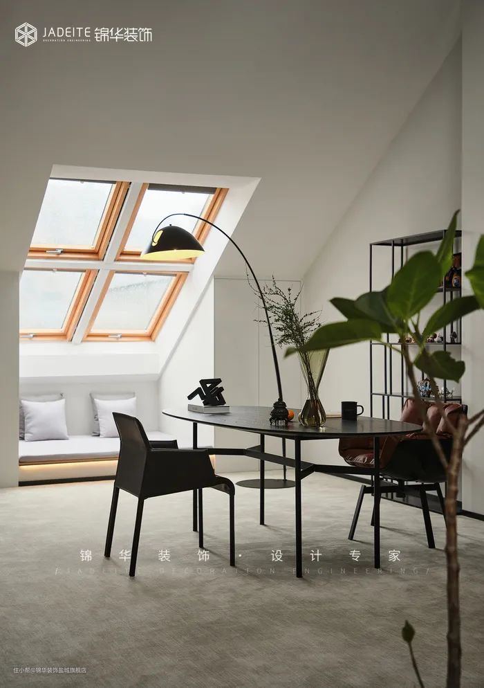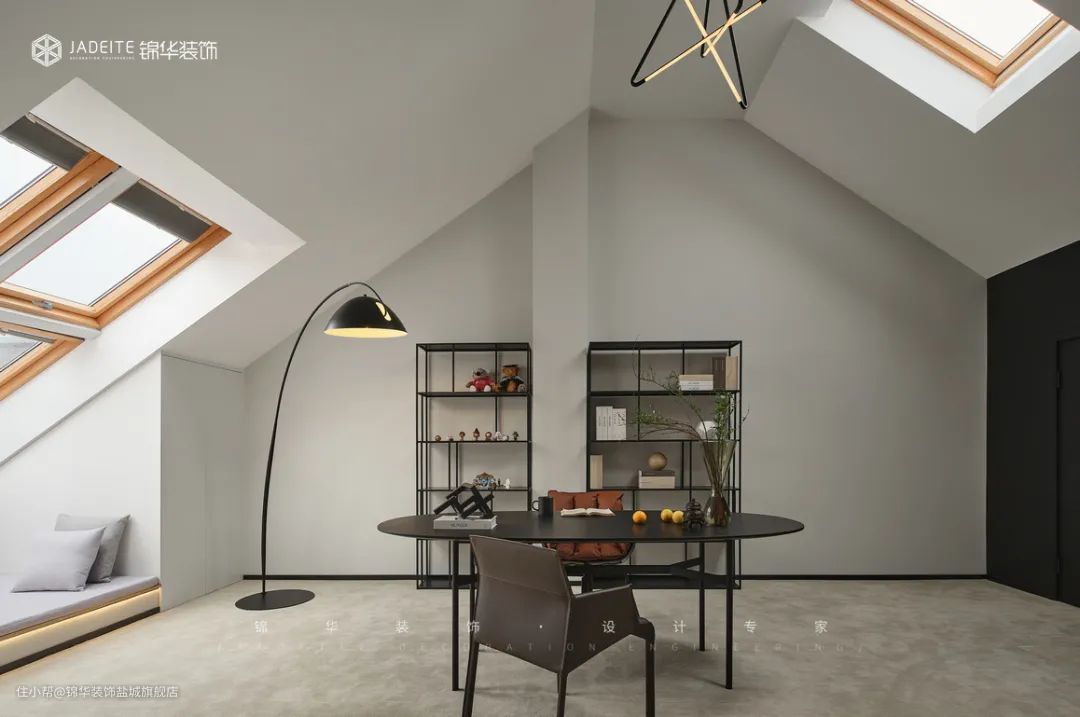 我们不把空间作为一种消极静止的存在,而是把它看做一种流动的力量。异形的空间结构,融入不规则的直线条的硬朗,让空间有秩序感,搭配满铺的地毯、圆润的书桌与落地灯让空间充满温柔的乐趣感。