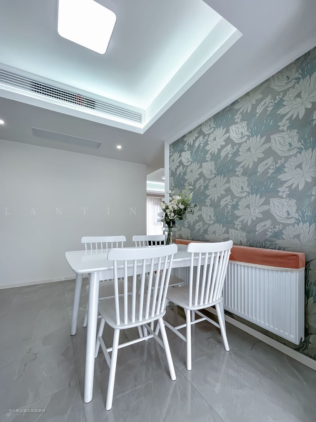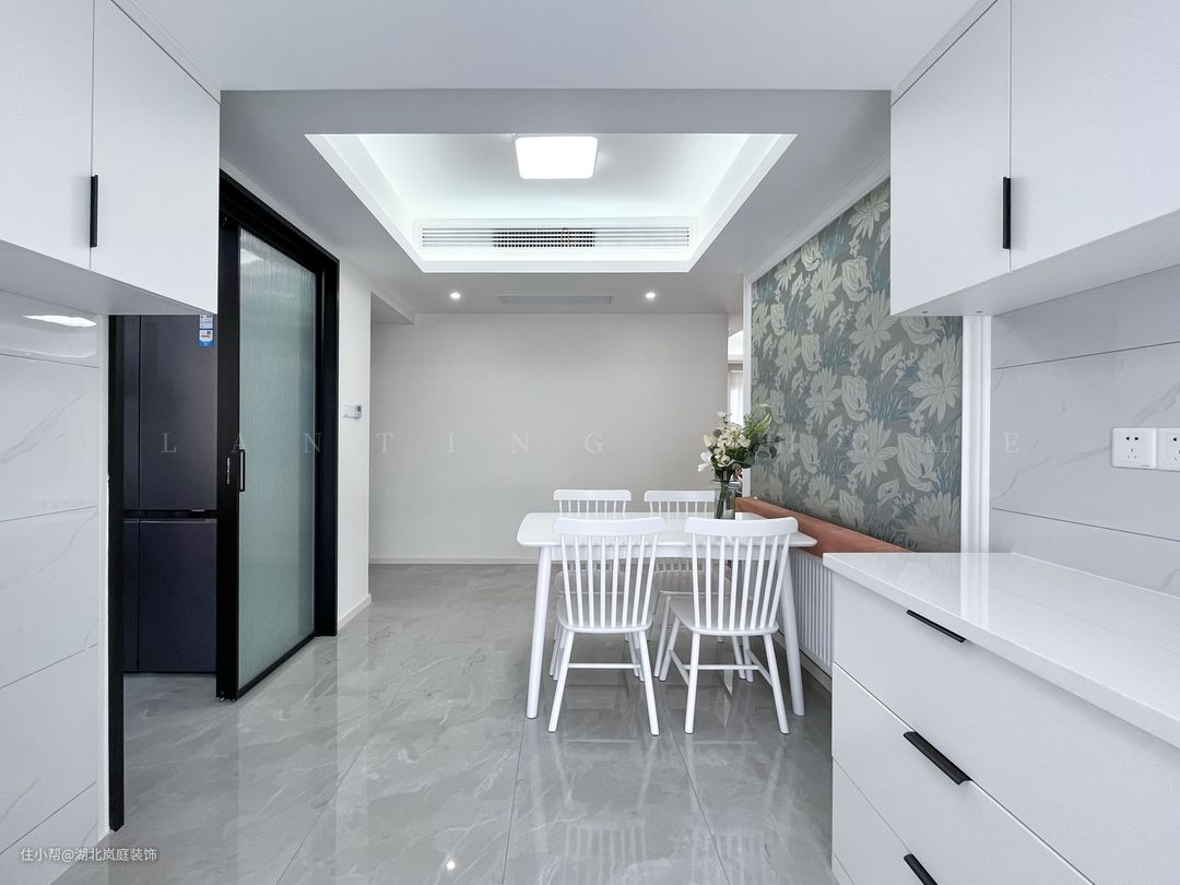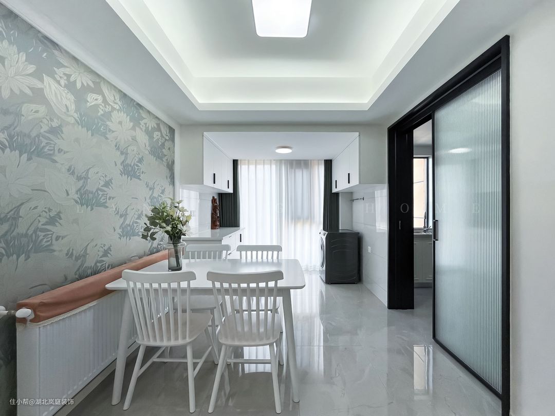 餐厅简单实用,挑选了简单的白色餐桌椅子,与之呼应的是浅蓝色的印花背景墙,效果很和谐。通过材质的转换,实现功能区的完美过渡与分隔。 利用餐厅的阳台设计了洗衣区并定制了地柜和吊柜,中间空出的区域方便置物。