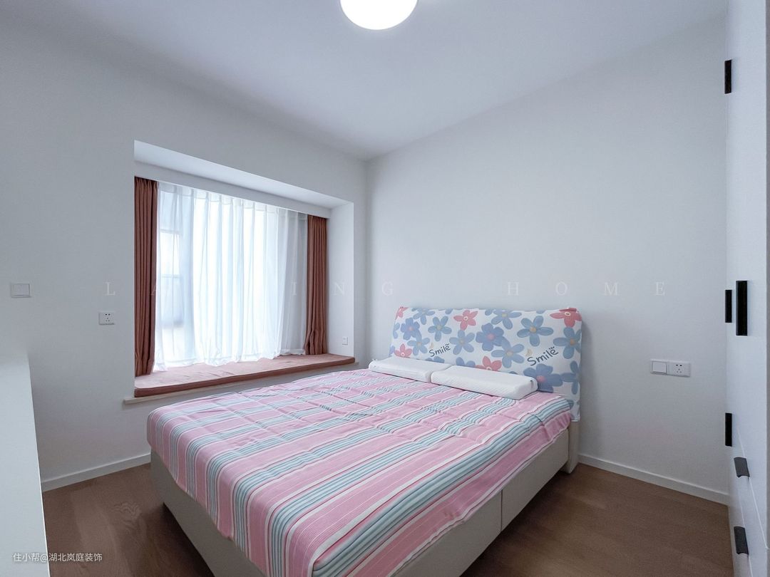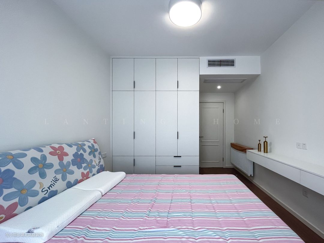主卧简单的白色+彩色的床品搭配。简约温馨而舒适。床尾设计了悬空抽屉柜,提升主卧的收纳能力。深邃的木质地板烘托出静谧的休憩氛围。步入室内,一天的疲惫也被洗净,居住者能静享一夜好眠。