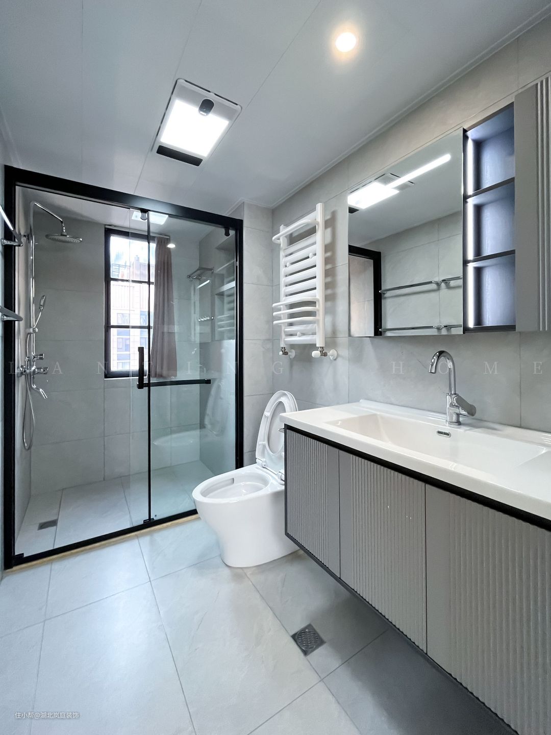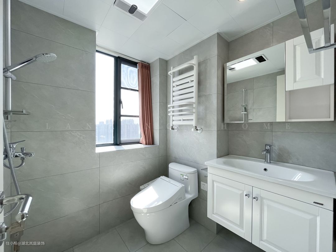 主卧卫生间采光充足,采用集成吊顶,为暖风排风照明一体。其中洗漱台做了悬空设计,让清理空间变得更便利。