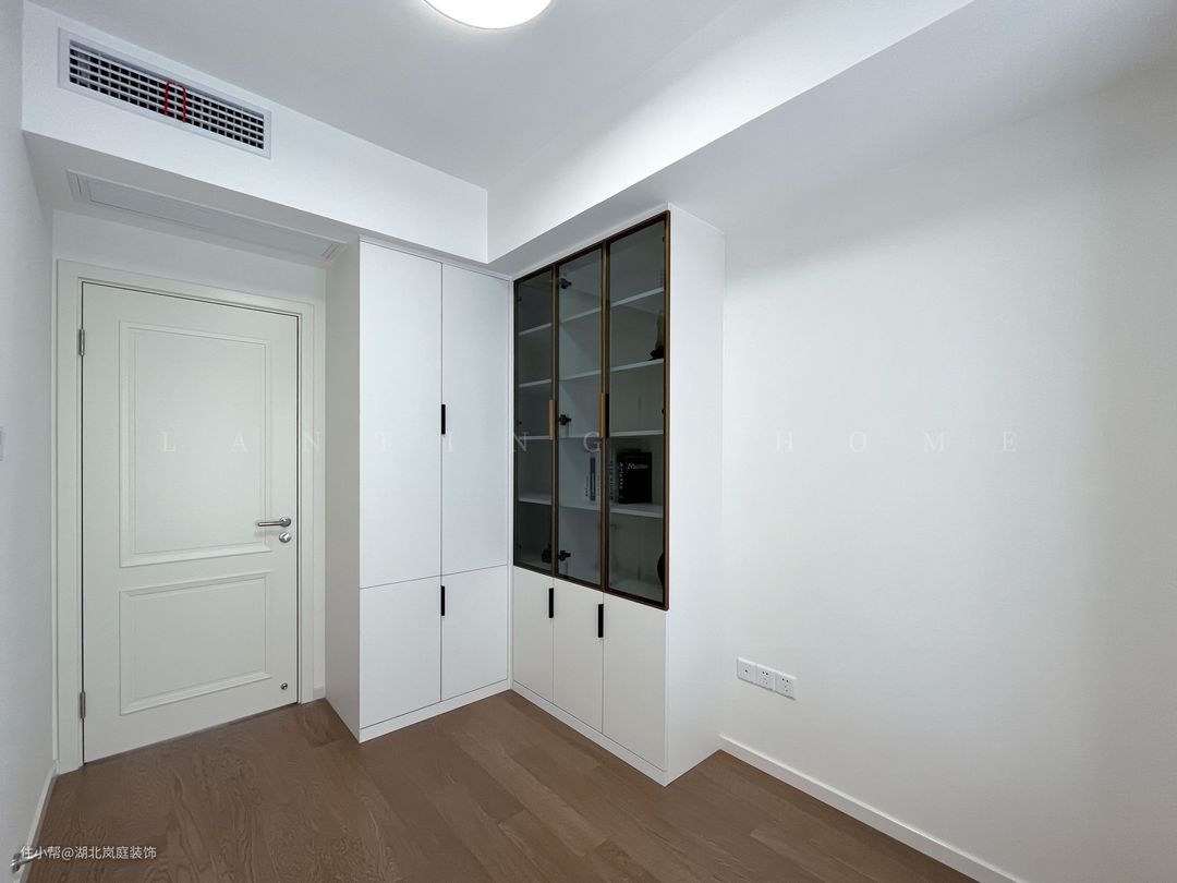书房加入定制书柜,采用原木柜门+黑色的玻璃展示,方便书籍存放和拿取,满足了收纳需求,还方便日常学习办公。飘窗的设计,为室内提供了更灵活的采光效果。