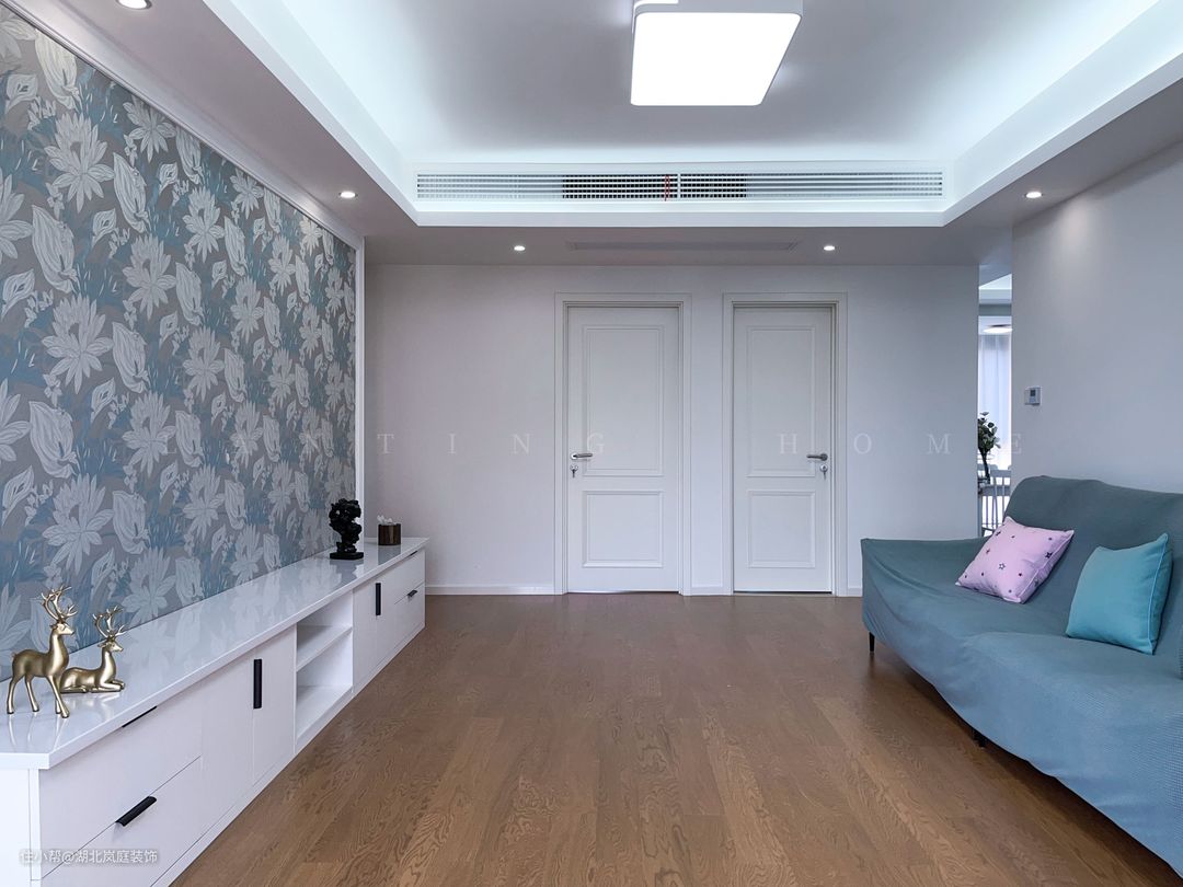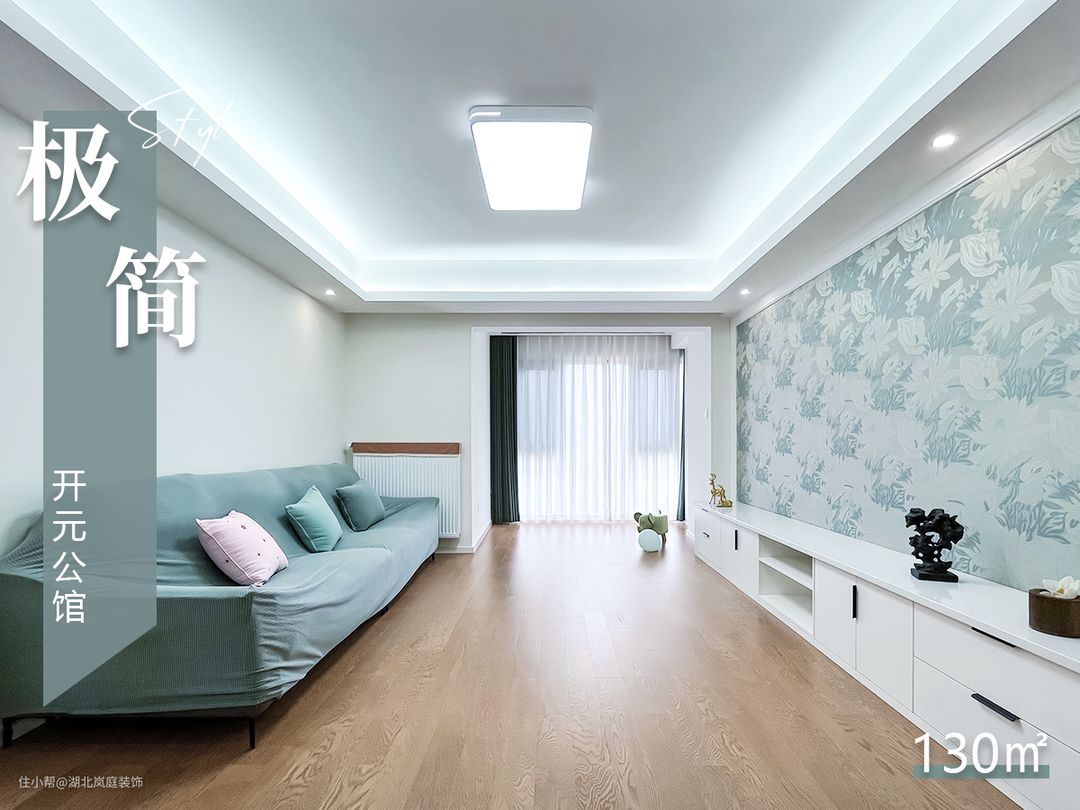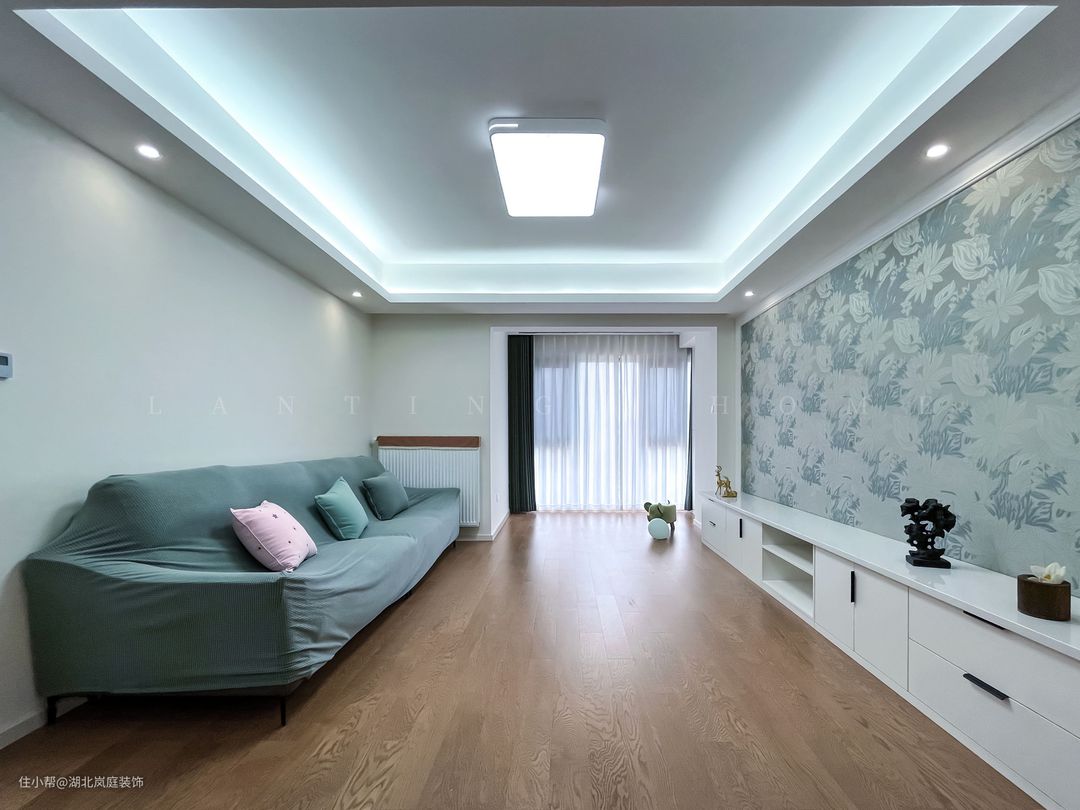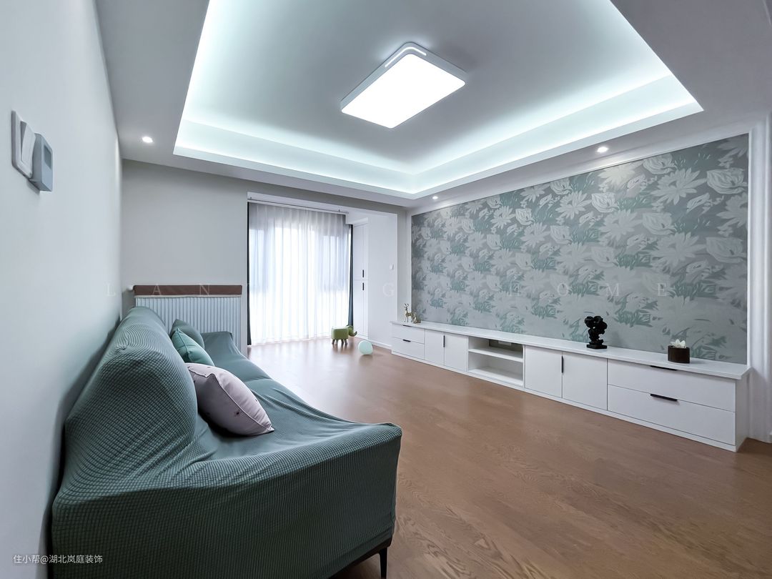 客厅简单舒适的沙发,背业主用心的包裹起来,也方便日常换洗。原木地板增加了室内的温馨感。电视背景墙采用餐厅同款的壁纸,形成呼应。 将客厅与阳台打通,不仅空间更开阔,采光也变得更好更直接。墨绿色的窗帘搭配轻柔质感的白色透光纱帘,营造轻缓舒适的氛围感。没有设置厚重的茶几,长条的电视柜满足简单的收纳,整个空间宽敞,非常适合长辈。 设计师用回字形吊顶取代传统吊顶本身的笨重感,同时也将吊顶展现的更加立体,丰富了空间的视觉层次。