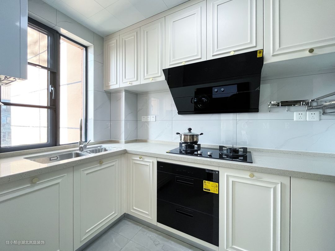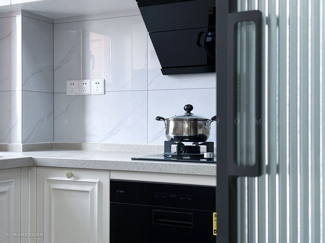 餐厅和书房采用长虹玻璃移门作为空间分隔,L型的厨房设计,不仅提高了空间整体利用率,也方便两人一同烹饪。奶白色橱柜+白色水磨石台面的搭配,简约干净且舒适。橱柜功能齐全,为业主提供最舒适的烹饪环境。