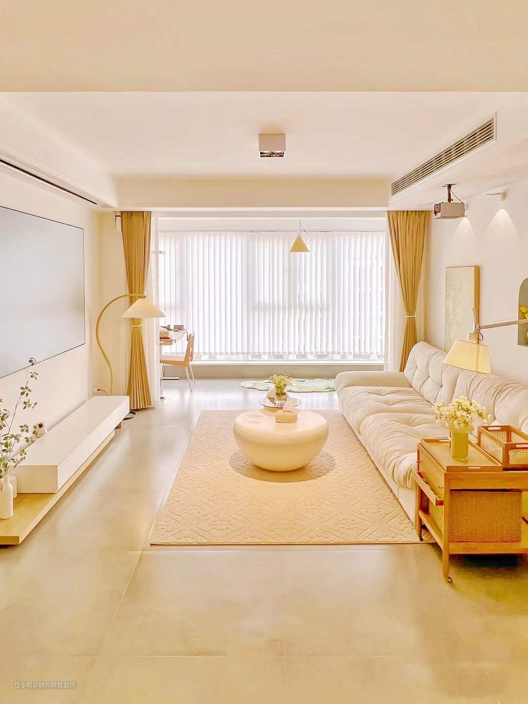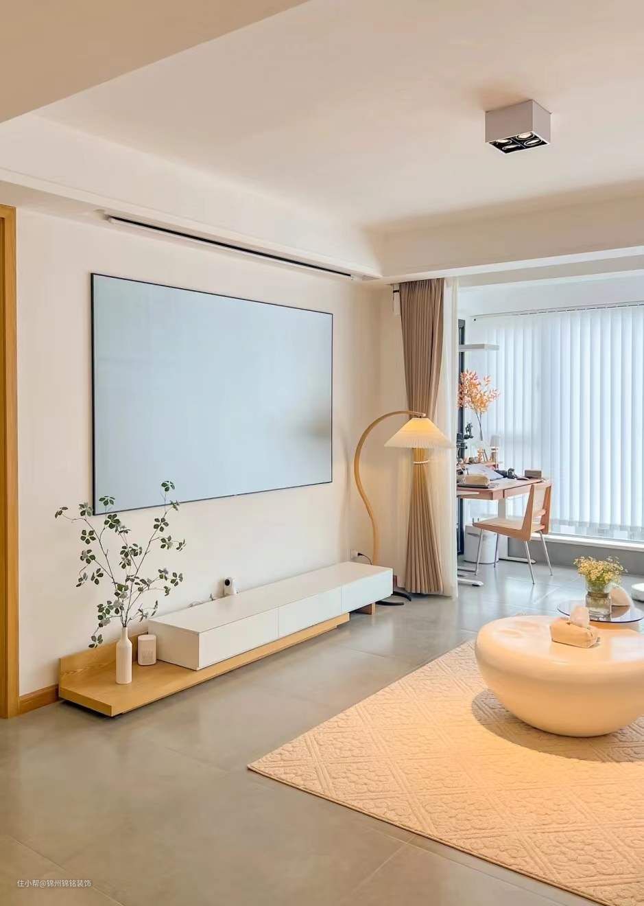 坚持了无主灯无吊顶设计,只在周围走一圈石膏线,简单干净不积灰,电视背景墙不做复杂造型,原木风伸缩电视柜好看又有格调。整个大横厅都是瓷砖通铺,不做过门石,视觉上显大又高级。