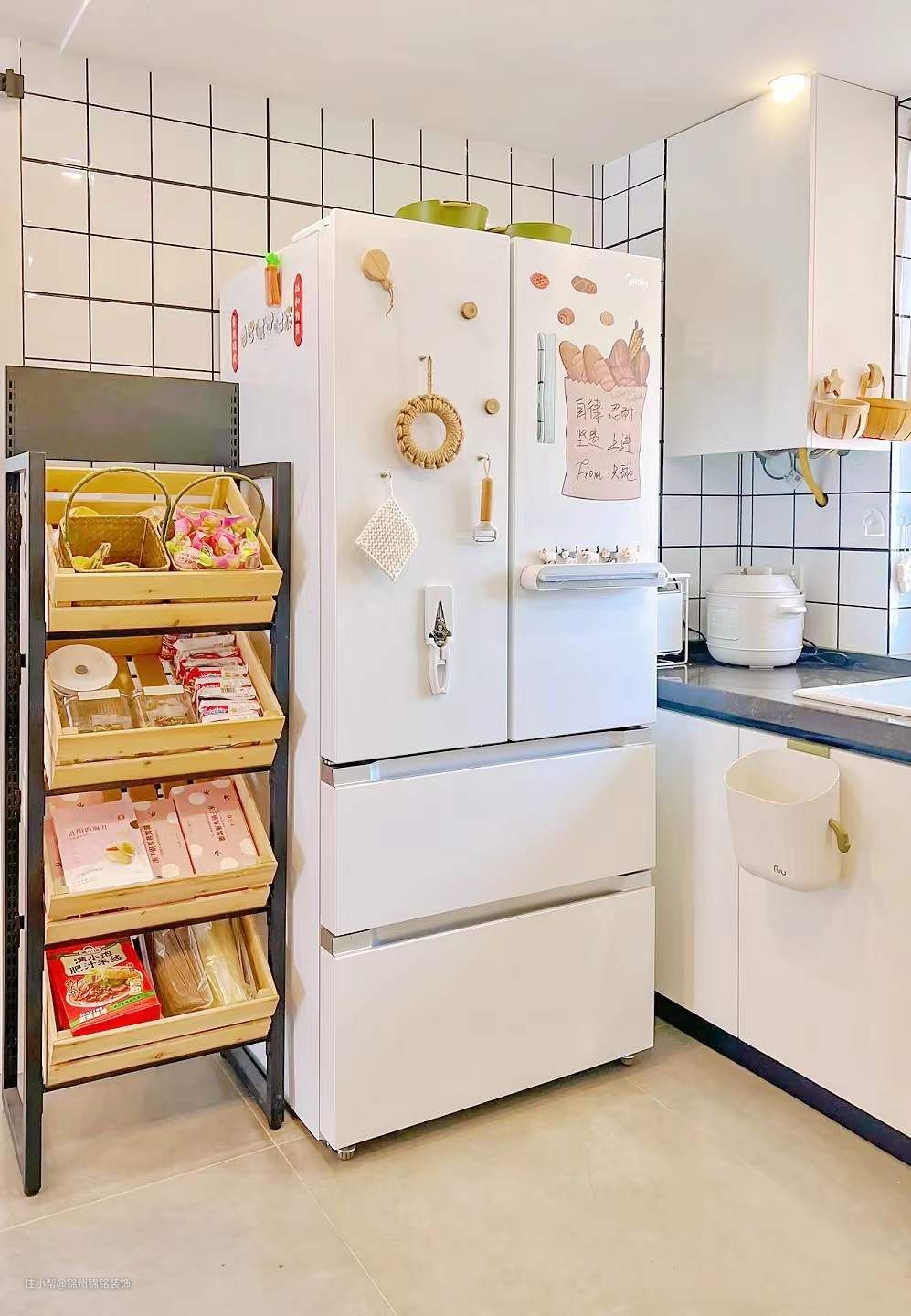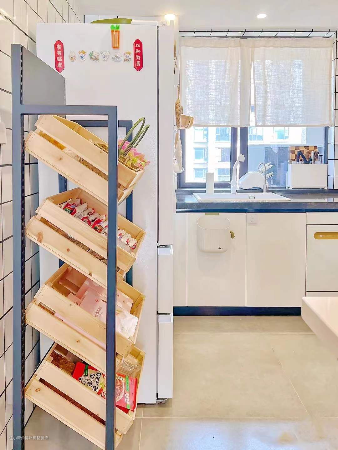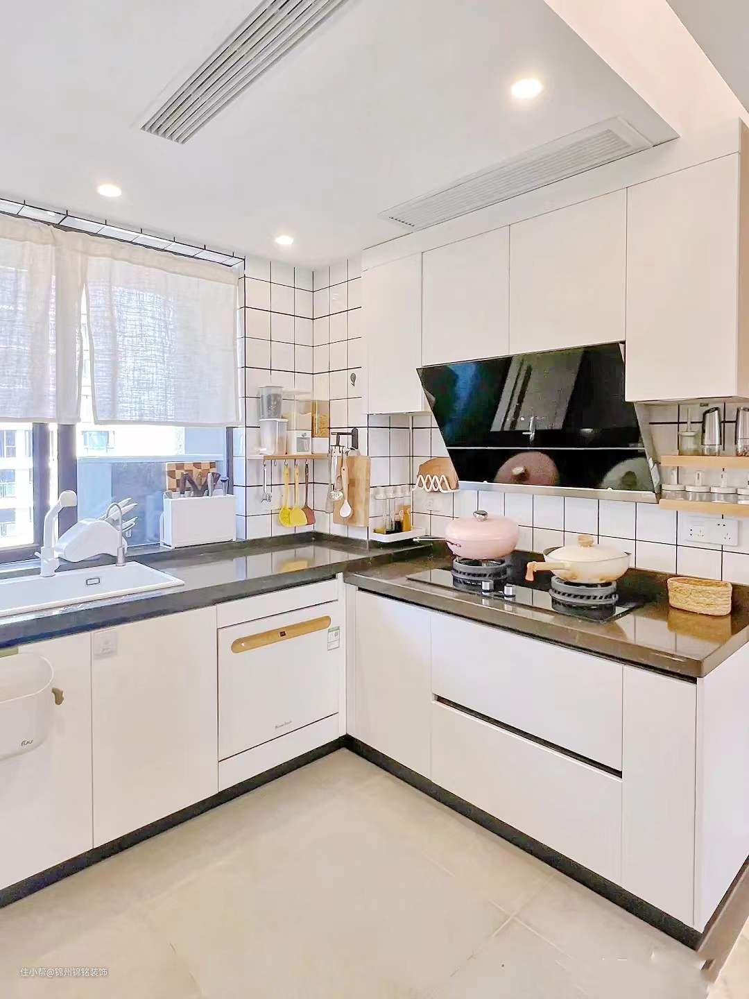 地面,800*800中性灰柔光砖。墙面,300*600方块砖+黑色美缝。关于橱柜,橱柜是定制的,整体采用“洗一切一炒”的动线设计,做了高低台面用起来更顺手。关于收纳,蔬果干粮适合收纳柜,其他一些物品 上墙收纳,这样既不影响台面,拿取也很顺手。