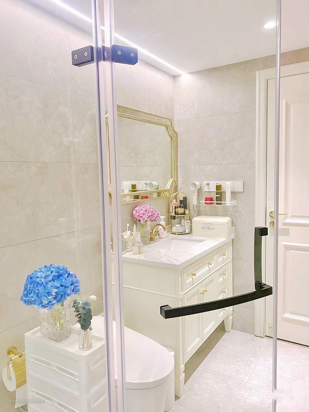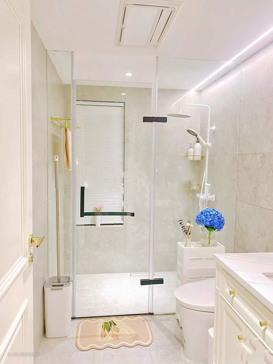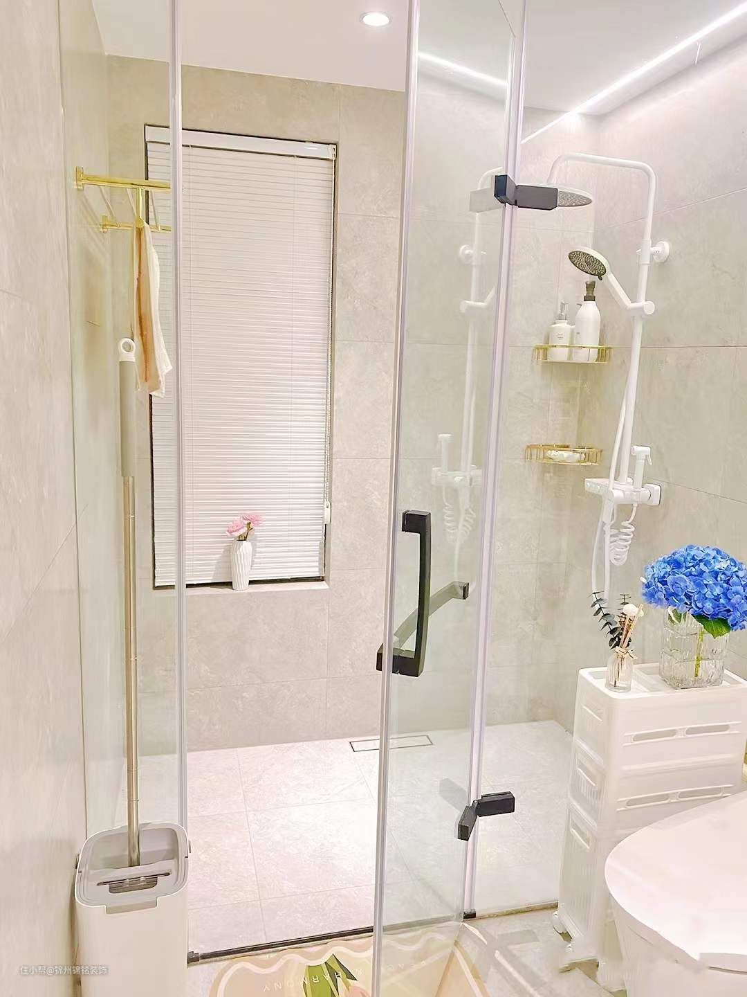 卫生间的软装搭配选择的浅色系,整个区域都不会显得很复杂,色调统一,浅色调的氛围感就出来啦。灰色砖贴上墙 发现整个卫生间还是显得很通透,很出效果。选的是冠珠88023云朵拉灰柔光砖,是很温柔的浅灰色。
