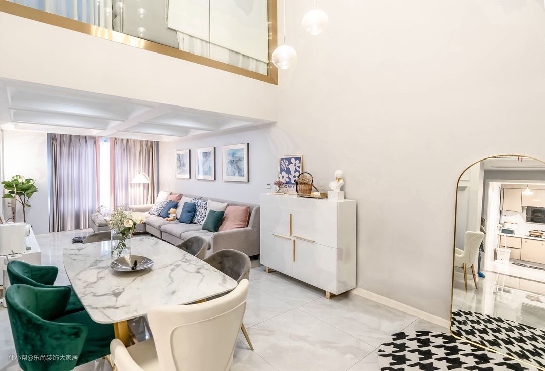 餐桌选用岩板材质,搭配墨绿色和银灰色餐椅,撞色设计更显高级,让整个空间也更加活泼。