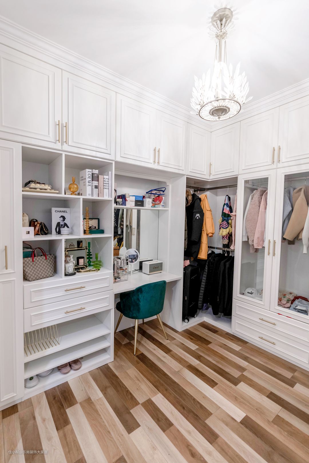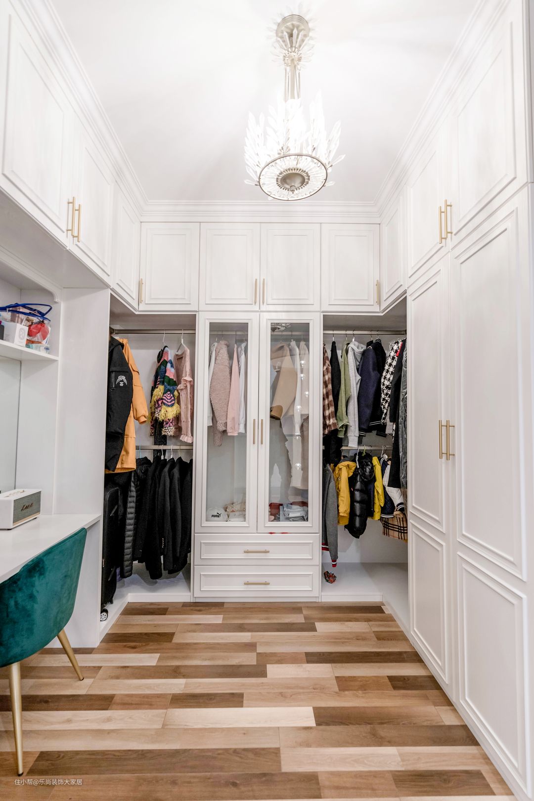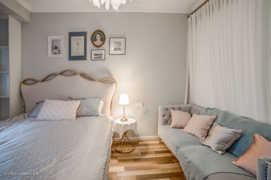 主卧面积较大,业主也要求设计出衣帽间在主卧,地砖通铺木地板,整个空间更和谐。搭配白色衣柜,高级感油然而生。