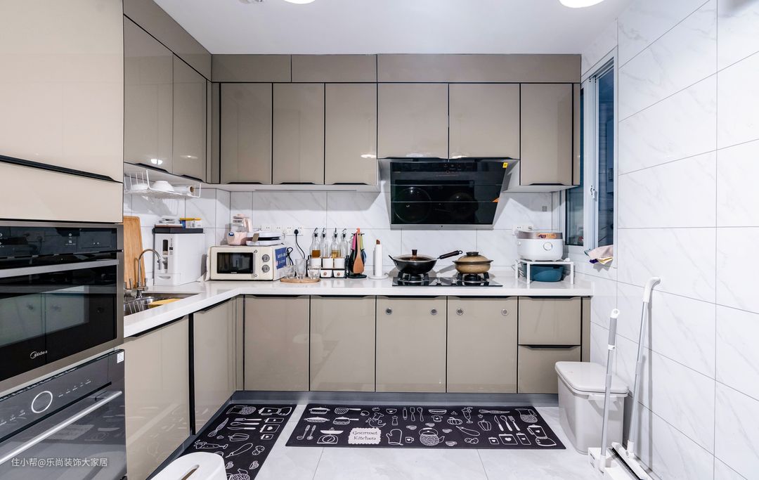 业主更喜欢开放式厨房,设计师也安排到位。浅咖色亮面橱柜门,搭配白色石英石台面,更显高级,日常更好清理。
