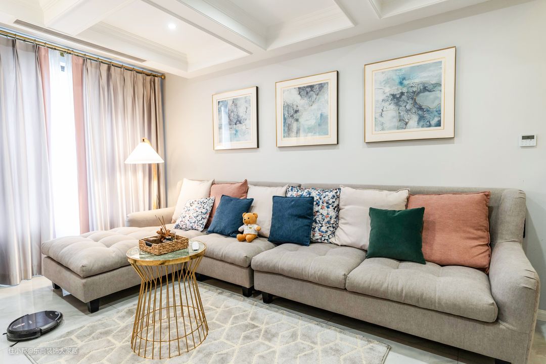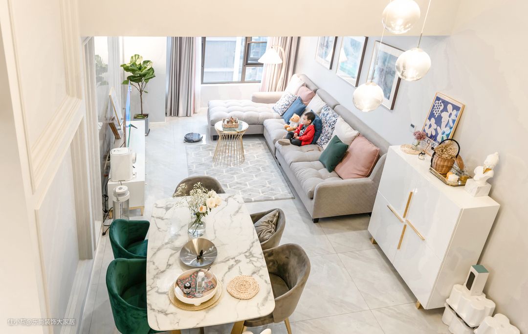客厅沙发采用L型银灰色,搭配墨绿色抱枕,和餐厅的餐椅颜色进行呼应,更加协调,整个空间也更加和谐显高级。
