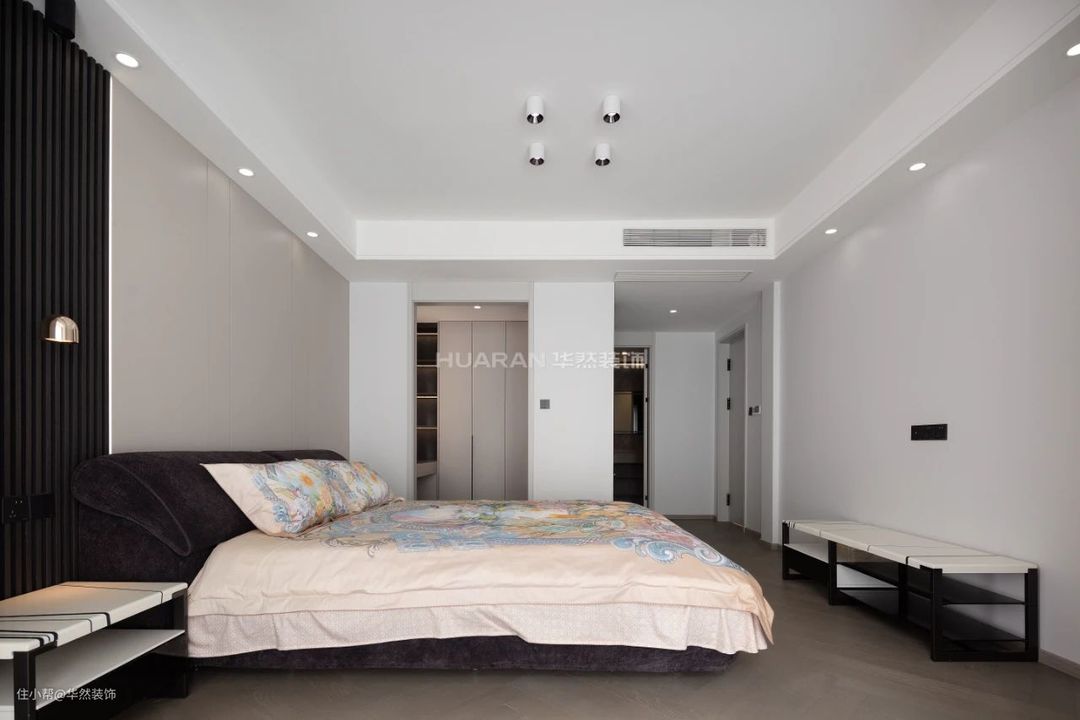 卧室门隐藏于背景墙之上 能够在视觉上切断和外界的联系 让主人能拥有一个更加私密的场所 倍感舒适自在 自然光线自大面积窗户投入卧室 给予空间更多的光影与自然 线条代替复杂装饰点缀床头 带来别具一格的现代美 亦从细节品味与众不同