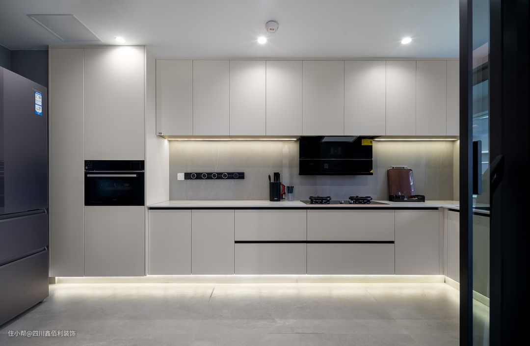 厨房以一组联动门,就能轻松切换厨房形态,兼顾互动性与独立性。奶白色的橱柜与客厅呼应,空间中的颜色不超过三种,打造一种清澈的干净感,即便是厨房这样充满烟火气的地方,给人的感觉照样高级。
