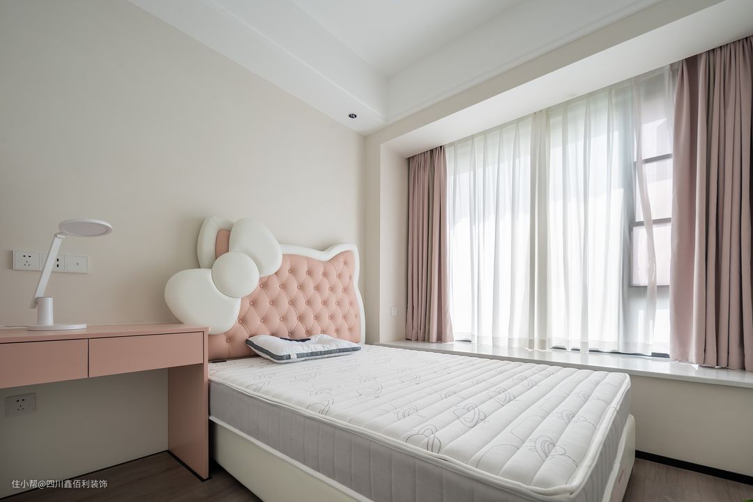 女儿房里粉色与家强烈对比,彷如混沌世界里一处秘密花园,让这个空间只为孩子存在。HelloKitty的可爱小床,温馨梦幻,一组高柜连接书桌,让学习也有了空间。