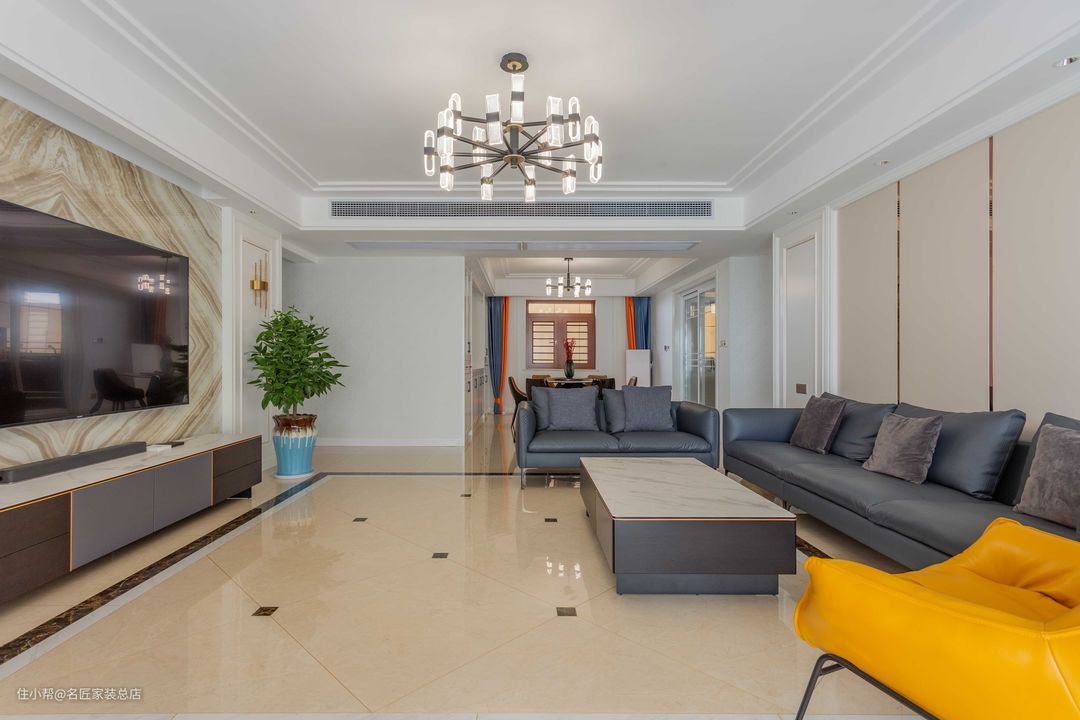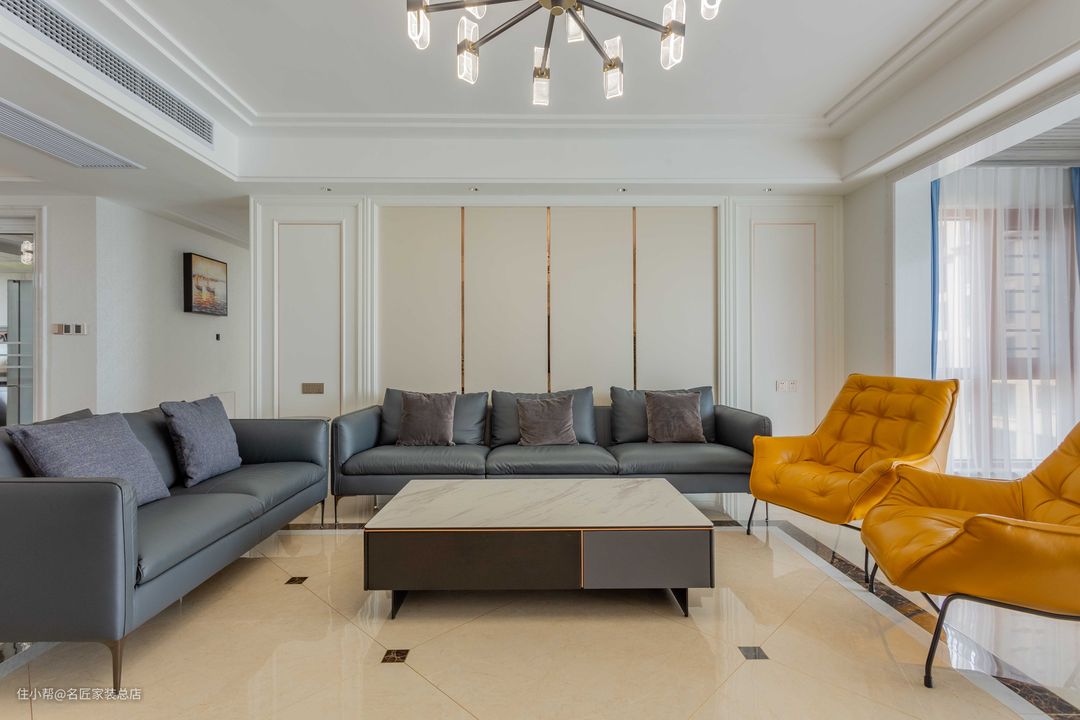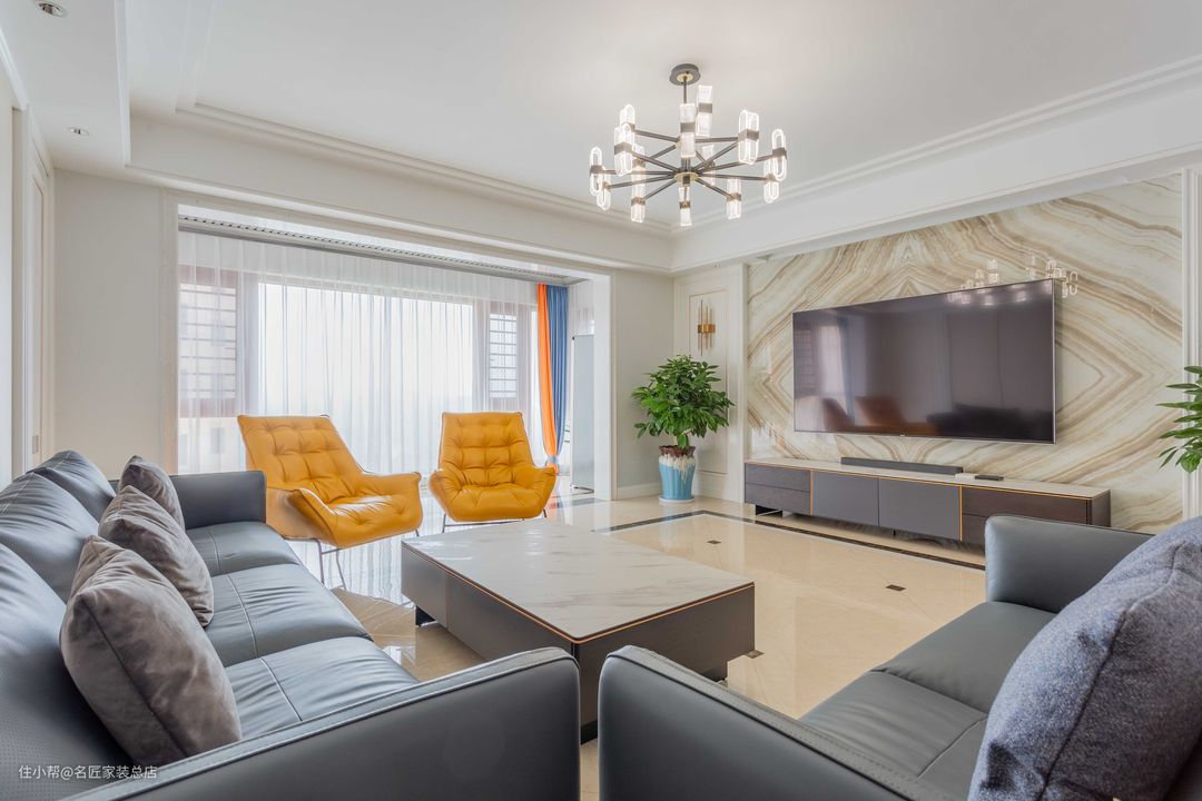 侧面开了一个全景落地窗,整个客餐厅的采光都非常的充足,多个小灯组成的打吊灯即使在夜晚也能照亮整个客厅。电视背景墙采用大理石纹路,从内向外发散的花纹以电视为中心,如同绽开的花朵。采用简约的皮质沙发,主体以灰色为主,搭配嫩黄色沙发椅。沙发背景墙用金属条分隔,简约又不失小心思。