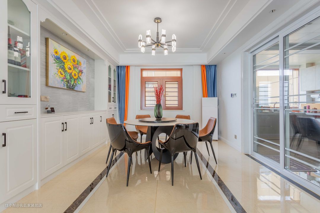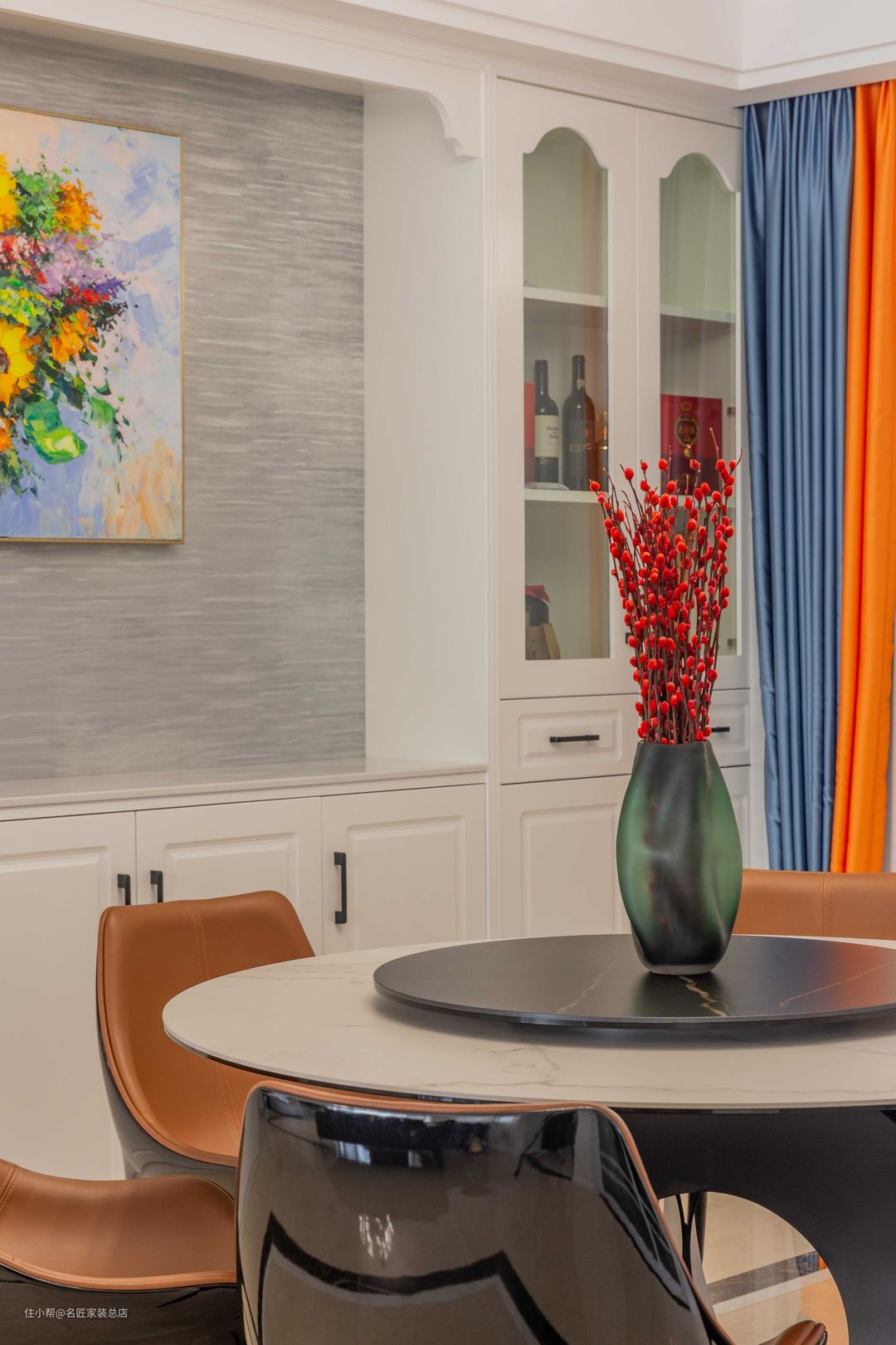 与客厅之间没有隔断,餐厅边白色柜子为餐厅增加了储物空间。中央空调不占地面空间,更加整洁有序。
