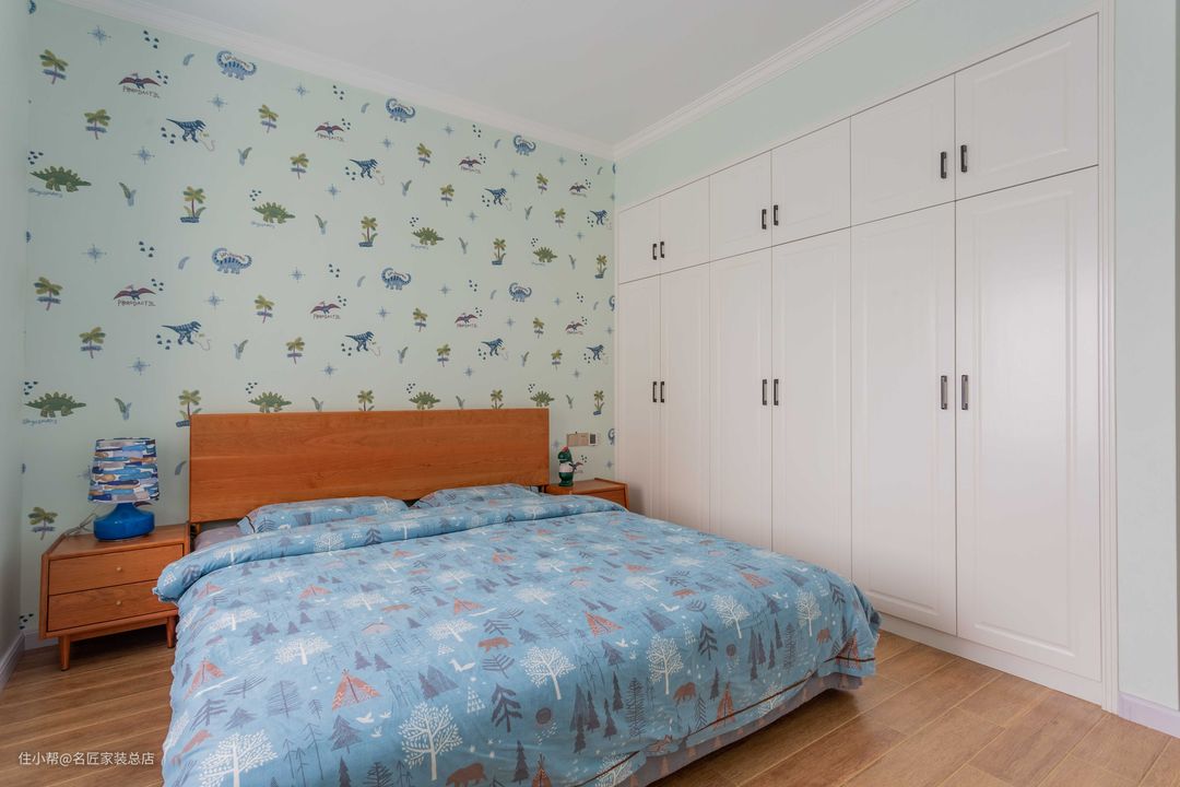 次卧是儿童房,小恐龙背景更符合孩子的审美。同样采用木制床头柜和地板搭配,除了背景墙,其他墙面也采用了绿色,保护孩子的眼睛。嵌入式的衣柜,面积可观,就算孩子将来长大空间也是足够的。