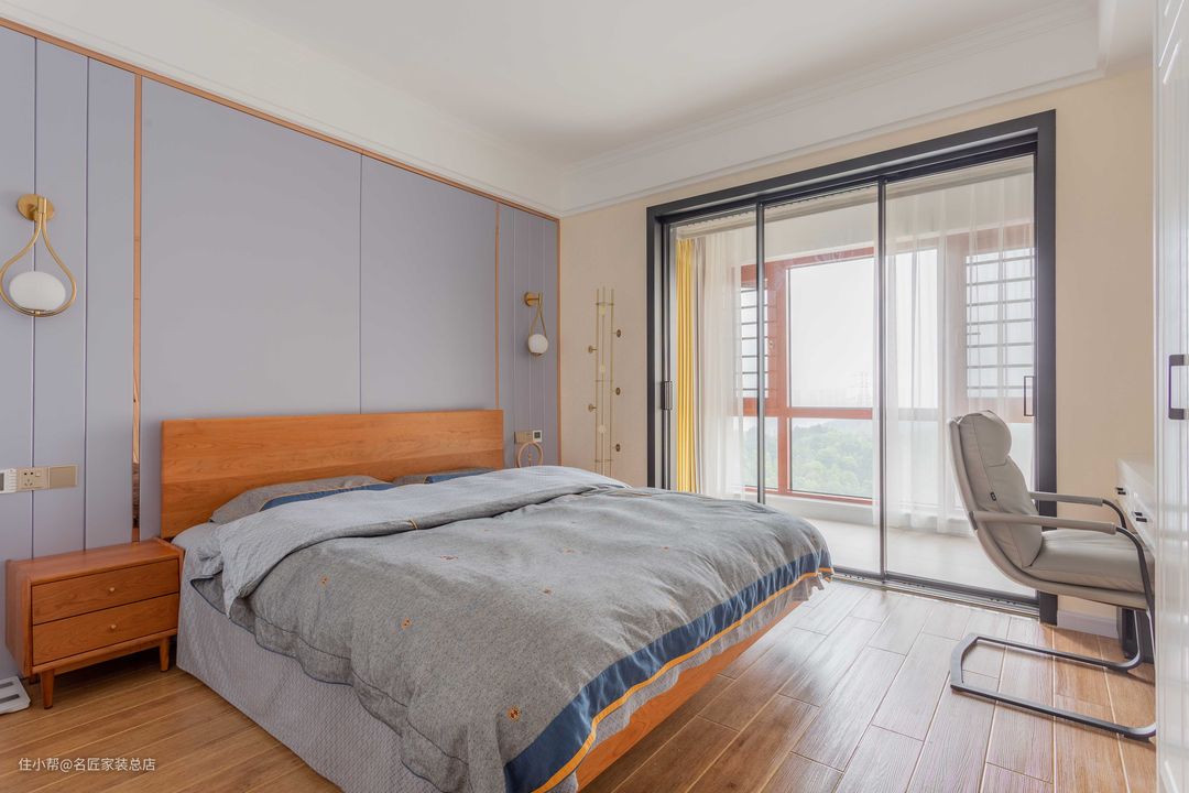 卧室也增加了一个小的阳台,全景落地窗将自然光引入室内。玻璃推拉门更好的欣赏风景,更好通风。除此之外,木质地板与窗外的风景契合,让人即使身处室内也能与自然融合。