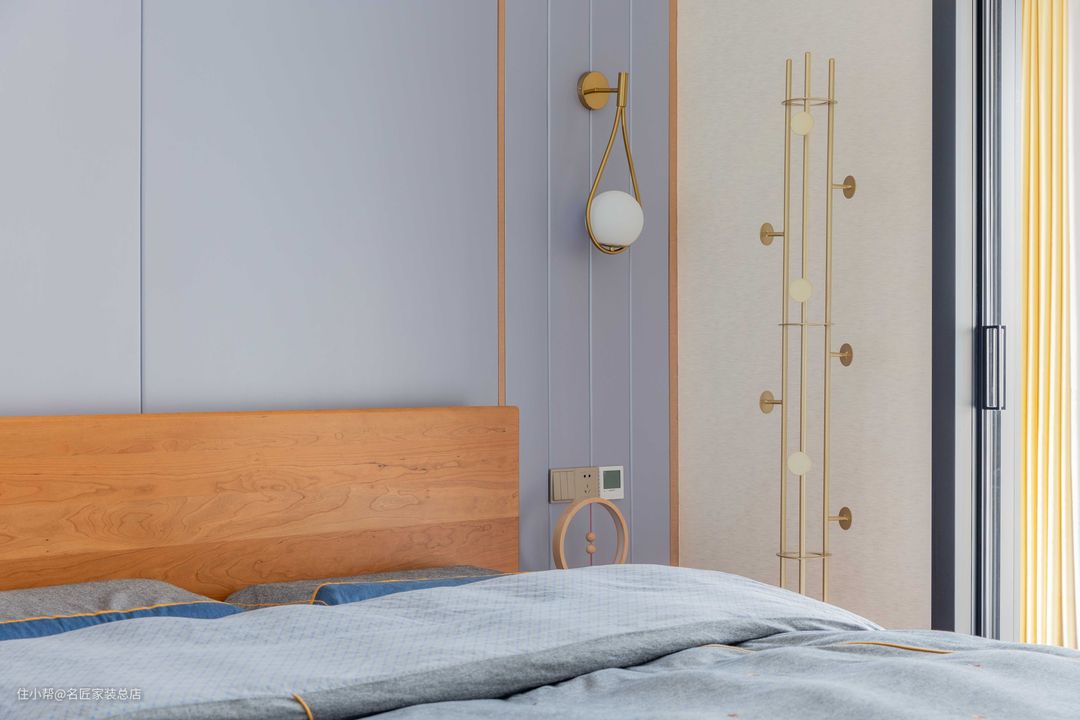 淡蓝色的背景墙与木质床架结合,淡雅的颜色令人心旷神怡,金属落地摆件与墙面台灯将房间的精致衬托出来。