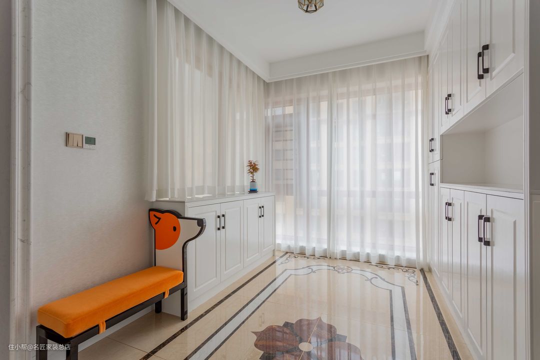 特意空出的生活小阳台,孩子们可以在这里玩耍,两侧都添加了柜体来增加储物空间。嵌入式的白色柜体不落灰,收纳空间大,白色显得干净素雅。小狗模样的长条座椅为整体空间加了一丝灵动,加上花纹处理的地板,不至于太单调。